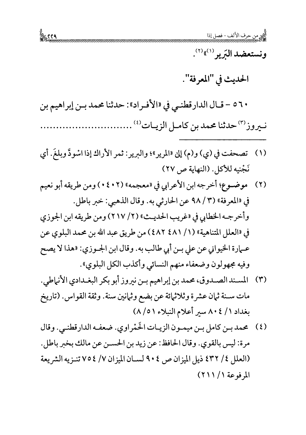 ٥٦٠ - قَالَ الدارقطني في "الأفراد": حَدَّثَنَا مُحَمَّد بن إبْرَاهِيم بن نيروز (¬٣) حَدَّثَنَا مُحَمَّد بن كامل الزيات (¬٤)
