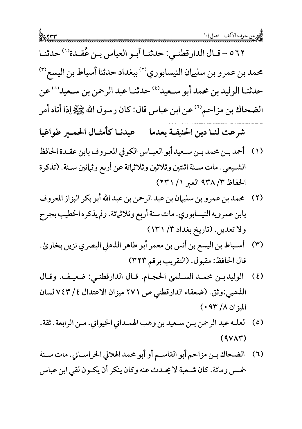 ٥٦٢ - قَالَ الدارقطني: حَدَّثَنَا أَبُو العباس بن عُقدة (¬١) حَدَّثَنَا مُحَمَّد بن عَمْرو بن سليمان النيسابوري (¬٢) ببغداد حَدَّثَنَا أسباط بن اليسع (¬٣) حَدَّثَنَا الوليد بن مُحَمَّد أَبُو سَعِيد (¬٤) حَدَّثَنَا عَبْد الرَّحمن بن سَعِيد (¬٥) عن الضحَّاك بن مزاحم (¬٦) عن ابن عَبَّاس قَالَ: كان رسول الله - صَلَّى اللهُ عَلَيْهِ وَسَلَّمَ - إِذَا أتاه أمر