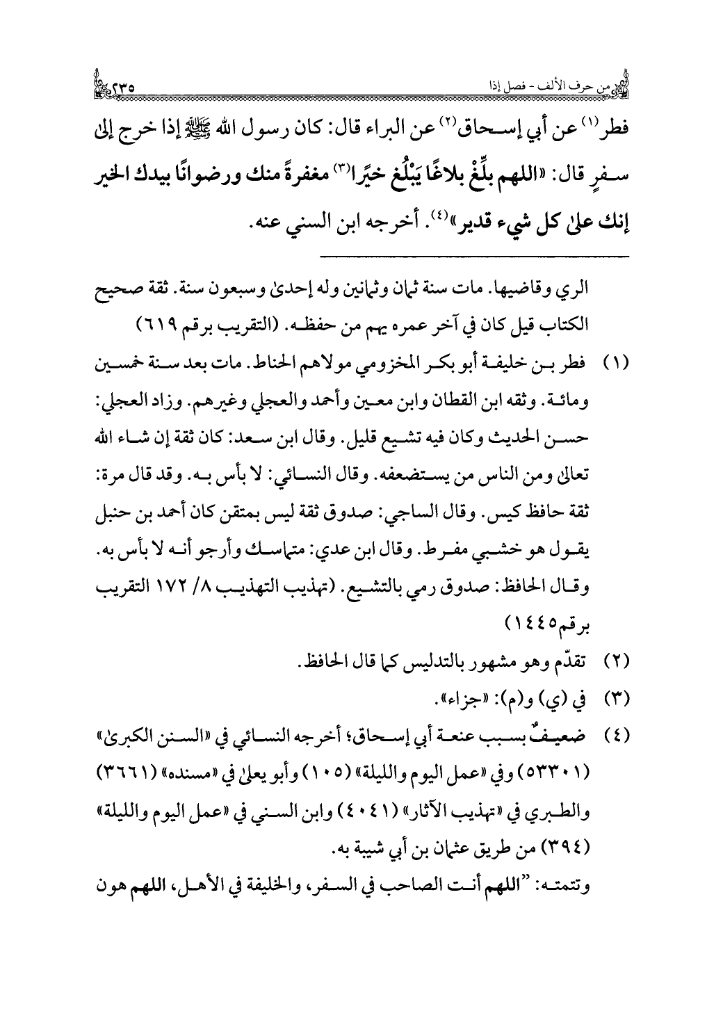 فطر (¬١) عن أَبِي إسحاق (¬٢) عن البراء قَالَ: كان رسول الله - صَلَّى اللهُ عَلَيْهِ وَسَلَّمَ - إِذَا خرج إِلى سفرٍ قَالَ: "اللَّهُمَّ بلِّغْ بلاغًا يَبْلُغ خيًرا (¬٣) مغفرةً منك ورضوانًا بيدك الخير إنك على كلّ شيء قدير" (¬٤). أخرجه ابن السني عنه.