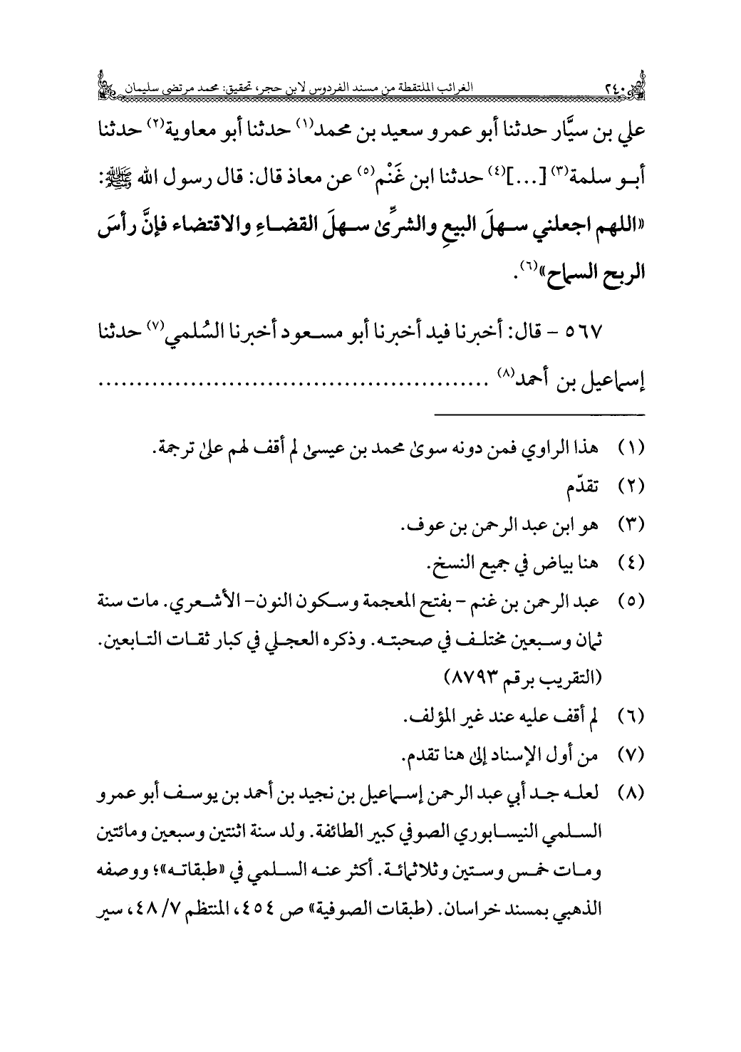 علي بن سيَّار حَدَّثَنَا أَبُو عَمْرو سَعِيد بن مُحَمَّد (¬١) حَدَّثَنَا أَبُو معاوية (¬٢) حَدَّثَنَا أَبُو سَلَمَة (¬٣) [ ... ] (¬٤) حَدَّثَنَا ابن غَنْم (¬٥) عن معاذ قَالَ: قَالَ رسول الله - صَلَّى اللهُ عَلَيْهِ وَسَلَّمَ -: "اللَّهُمَّ اجعلني سهلَ البيعِ والشرِّى سهلَ القضاءِ والاقتضاء فإنَّ رأسَ الربح السماح" (¬٦).