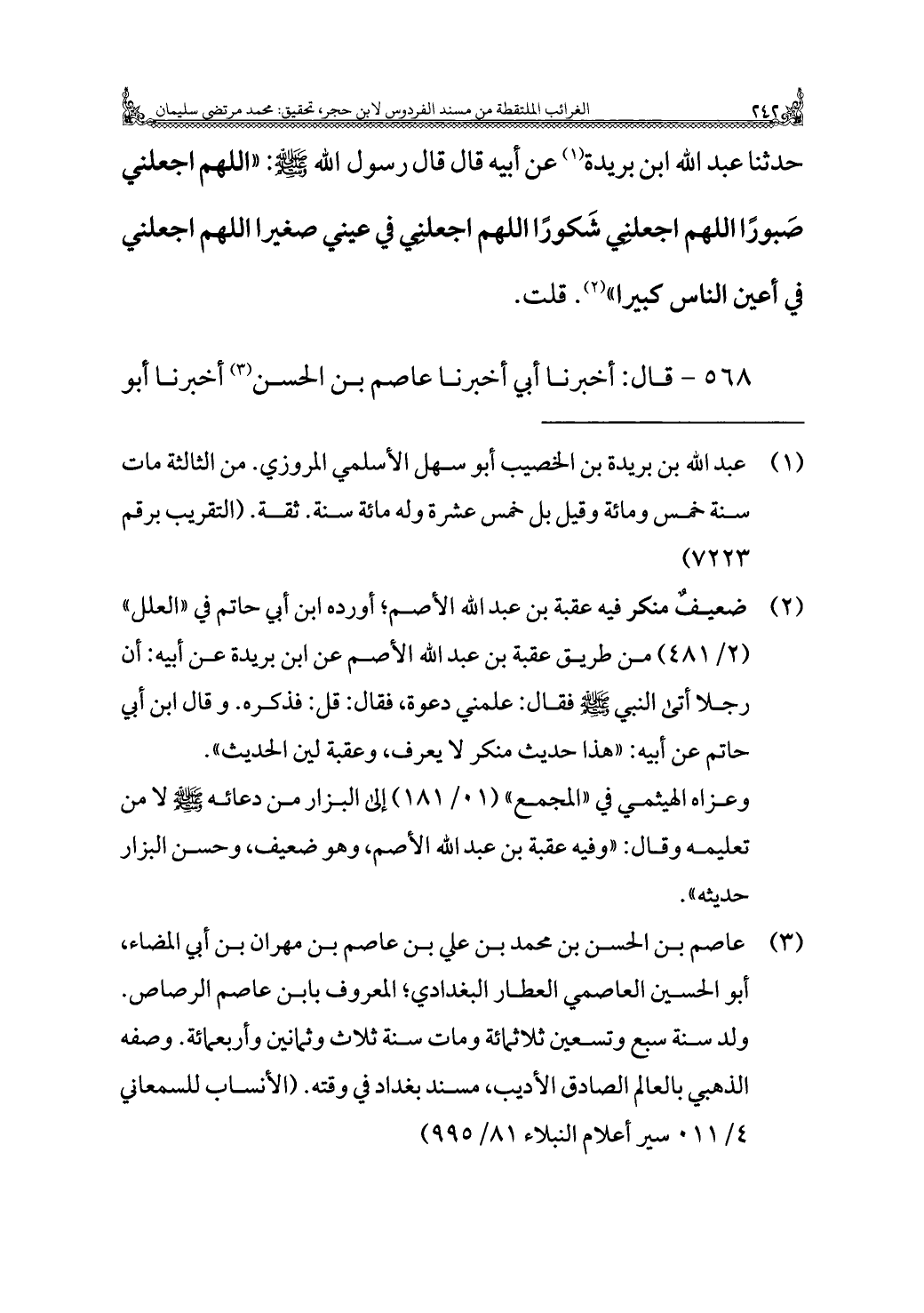 (¬٢) ضعيفٌ منكر فيه عُقبة بن عَبْد الله الأصم؛ أورده ابن أبي حاتم في "العلل" (٢/ ٤٨١) من طريق عُقبة بن عَبْد الله الأصم عن ابن بُرَيْدَة عن أبِيهِ: أن رجلًا أتى النَّبِيّ - صَلَّى اللهُ عَلَيْهِ وَسَلَّمَ - فقال: علمني دعوة، فقال: قل: فذكره. وقَالَ ابن أَبِي حاتم عن أبِيهِ: "هذا حَدِيث منكر لا يعرف، وعقبة لين الحديث".