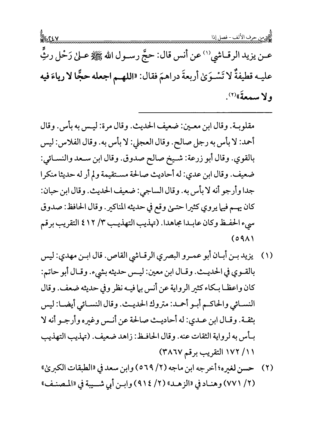 (¬١) يزيد بن أبان أَبُو عَمْرو البصري الرقاشي القاص. قَالَ ابن مهدي: ليس بالقوي في الحديث. وقال ابن معين: ليس حديثه بشيء. وقال أَبُو حاتم: كان واعظا بكاء كثير الرواية عن أنس بما فيه نظر وفي حديثه ضعف. وقال النسائي والحاكم أَبُو أحمد: متروك الحديث. وقال النسائي أيضًا: ليس بثقة. وقال ابن عديّ: له أحاديث صالحة عن أنس وغيره وأرجو أَنَّهُ لا بأس به لرواية الثقات عنه. وقال الحافظ: زاهد ضعيف. تهذيب التهذيب ١١/ ١٧٢ التقريب برقم ٣٨٦٧)