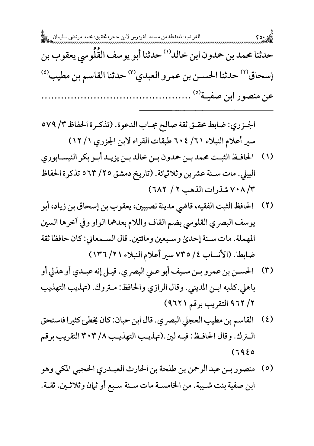 حَدَّثَنَا مُحَمَّد بن حمدون بن خالد (¬١) حَدَّثَنَا أَبُو يوسف القُلُوسي يعقوب بن إسحاق (¬٢) حَدَّثَنَا الحسن بن عَمْرو العبدي (¬٣) حَدَّثَنَا القاسم بن مطيب (¬٤) عن منصور ابن صفية (¬٥)