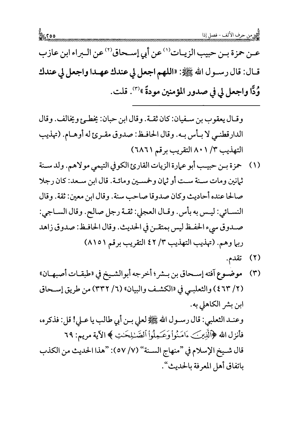 عن حمزة بن حبيب الزيات (¬١) عن أَبِي إسحاق (¬٢) عن البراء بن عازب قَالَ: قَالَ رسول الله - صَلَّى اللهُ عَلَيْهِ وَسَلَّمَ -: "اللَّهُمَّ اجعل لي عندك عهدا واجعل لي عندك وُدًّا واجعل لي في صدور المؤمنين مودةً" (¬٣). قلت.