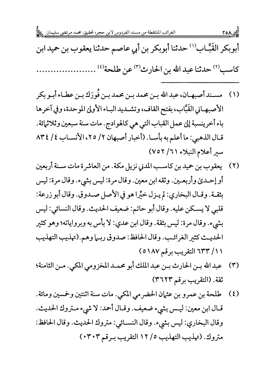 أَبُو بكر القَبَّاب (¬١) حَدَّثَنَا أَبُو بكر بن أَبِي عاصم حَدَّثَنَا يعقوب بن حميد بن كاسب (¬٢) حَدَّثَنَا عَبْد الله بن الحارث (¬٣) عن طلحة (¬٤)