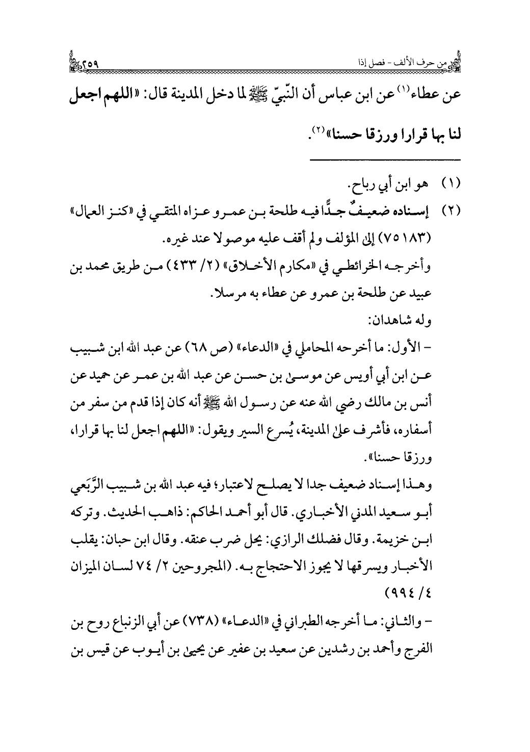 - الأول: ما أخرجه المحاملي في "الدعاء" (ص ٦٨) عن عبد الله بن شبيب عن ابن أبي أويس عن موسى بن حسن عن عبد الله بن عمر عن حميد عن أنس بن مالك رضي الله عنه عن رسول الله - صلى الله عليه وسلم - أنه كان إذا قدم من سفر من أسفاره، فأشرف على المدينة، يُسرع السير ويقول: "اللهم اجعل لنا بها قرارا، ورزقا حسنًا".