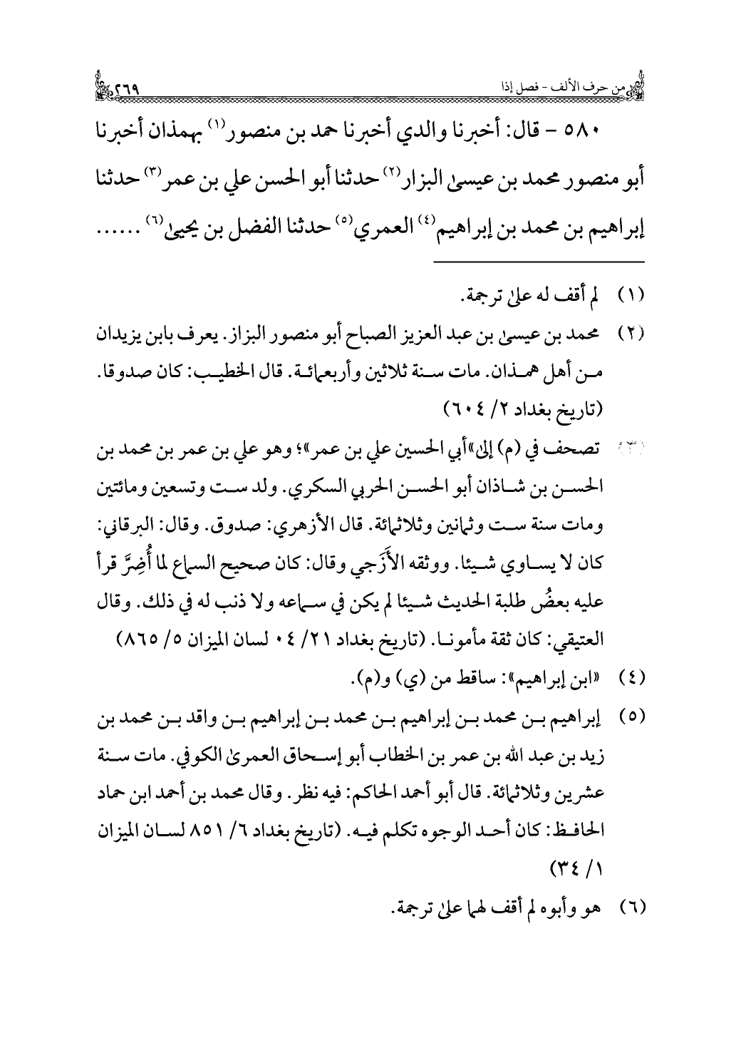٥٨٠ - قال: أخبرنا والدي أخبرنا حمد بن منصور (¬١) بهمذان أخبرنا أبو منصور محمد بن عيسى البزار (¬٢) حدثنا أبو الحسن علي بن عمر (¬٣) حدثنا إبراهيم بن محمد بن إبراهيم (¬٤) العمري (¬٥) حدثنا الفضل بن يحيى (¬٦)