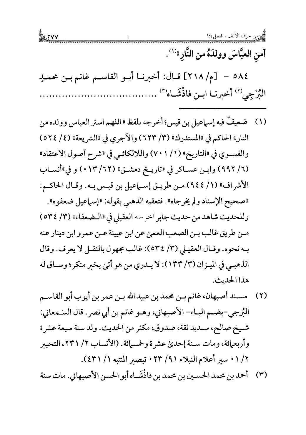 (¬١) ضعيفٌ فيه إسماعيل بن قيس؛ أخرجه بلفظ "اللهم استر العباس وولده من النار" الحاكم في "المستدرك" (٣/ ٦٢٣) والآجري في "الشريعة" (٤/ ٥٢٤) والفسوي في "التاريخ" (١/ ٧٠١) واللالكائي في "شرح أصول الاعتقاد" (٦/ ٩٩٢) وابن عساكر في "تاريخ دمشق" (٦٢/ ٠١٣) وفي "أنساب الأشراف" (١/ ٩٤٤) من طريق إسماعيل بن قيس به. وقال الحاكم: "صحيح الإسناد ولم يخرجاه". فتعقَّبه الذهبي بقوله: "إسماعيل ضعفوه".