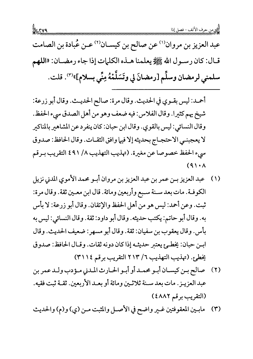 عبد العزيز بن مروان (¬١) عن صالح بن كيسان (¬٢) عن عُبادة بن الصامت قال: كان رسول الله - صلى الله عليه وسلم - يعلمنا هذه الكلمات إذا جاء رمضان: "اللهم سلمني لرمضان وسلِّم [رمضانَ لي وتَسَلَّمْهُ مِنّي بسلام] " (¬٣). قلت.