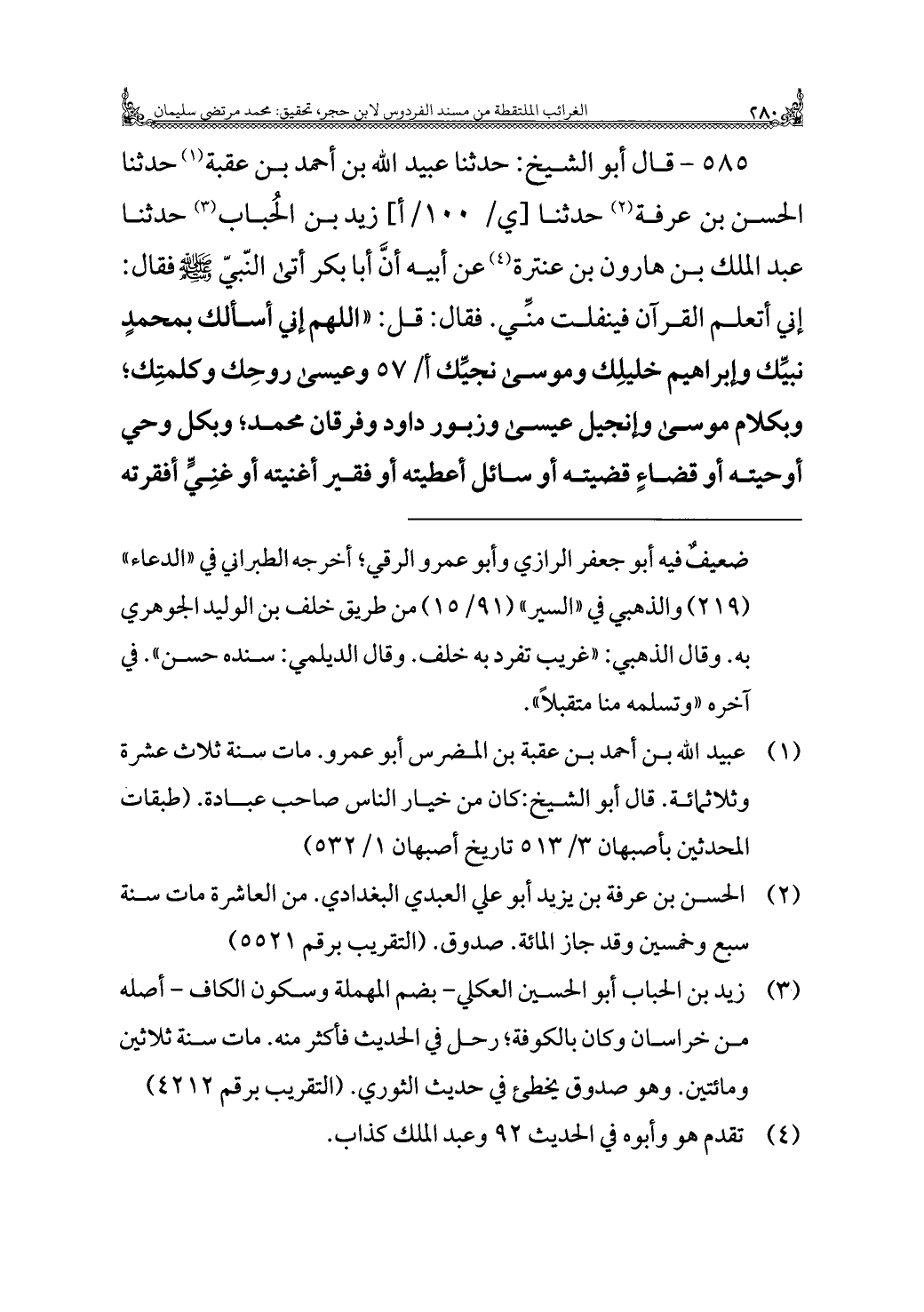 ٥٨٥ - قال أبو الشيخ: حدثنا عبيد الله بن أحمد بن عقبة (¬١) حدثنا الحسن بن عرفة (¬٢) حدثنا زيد بن الحُباب (¬٣) حدثنا عبد الملك بن هارون بن عنترة (¬٤) عن أبيه أنَّ أبا بكر أتى النّبيّ - صلى الله عليه وسلم - فقال: إني أتعلم القرآن فينفلت منِّي. فقال: قل: "اللهم إني أسألك بمحمدٍ نبيك وإبراهيم خليلِك وموسى نجيِّك وعيسى روحِك وكلمتِك؛ وبكلام موسى وإنجيل عيسى وزبور داود وفرقان محمد؛ وبكل وحي أوحيته أو قضاءٍ قضيته أو سائل أعطيته أو فقير أغنيته أو غنِى أفقرته