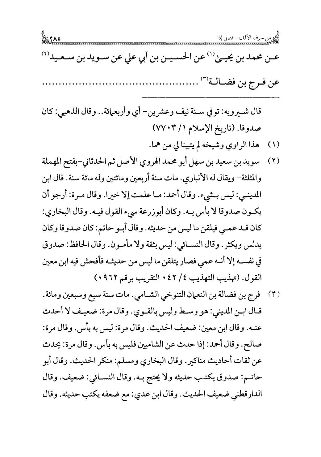 عن محمد بن يحيى (¬١) عن الحسين بن أبي علي عن سويد بن سعيد (¬٢) عن فرج بن فضالة (¬٣)