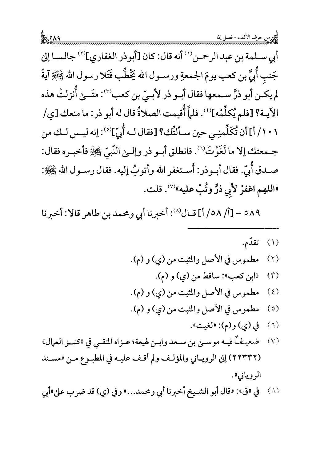 أبي سلمة بن عبد الرحمن (¬١) أنه قال: كان [أبو ذر الغفاري] (¬٢) جالسًا إلى جَنبِ أُبي بن كعب يومَ الجمعةِ ورسول الله يَخْطُب فتلا رسول الله - صلى الله عليه وسلم - آية لم يكن أبو ذرٍّ سمعها فقال أبو ذر لأبيّ بن كعب (¬٣): متَى أُنزلتْ هذه الآية؟ [فلم يُكلِّمْه] (¬٤). فلمّاَ أُقيمت الصَّلاةُ قال له أبو ذر: ما منعك أن تُكَلِّمنِي حين سألتُك؟ [فقال له أُبي] (¬٥): إنه ليس لك من جمعتك إلا ما لَغَوْتَ (¬٦). فانطلق أبو ذر وإلى النّبيّ - صلى الله عليه وسلم - فأخبره فقال: صدق أُبي. فقال أبو ذر: أَستغفر الله وأتوبُ إليه. فقال رسول الله - صلى الله عليه وسلم -: "اللهم اغفرْ لأبِي ذر وتُبْ عليه" (¬٧). قلت.