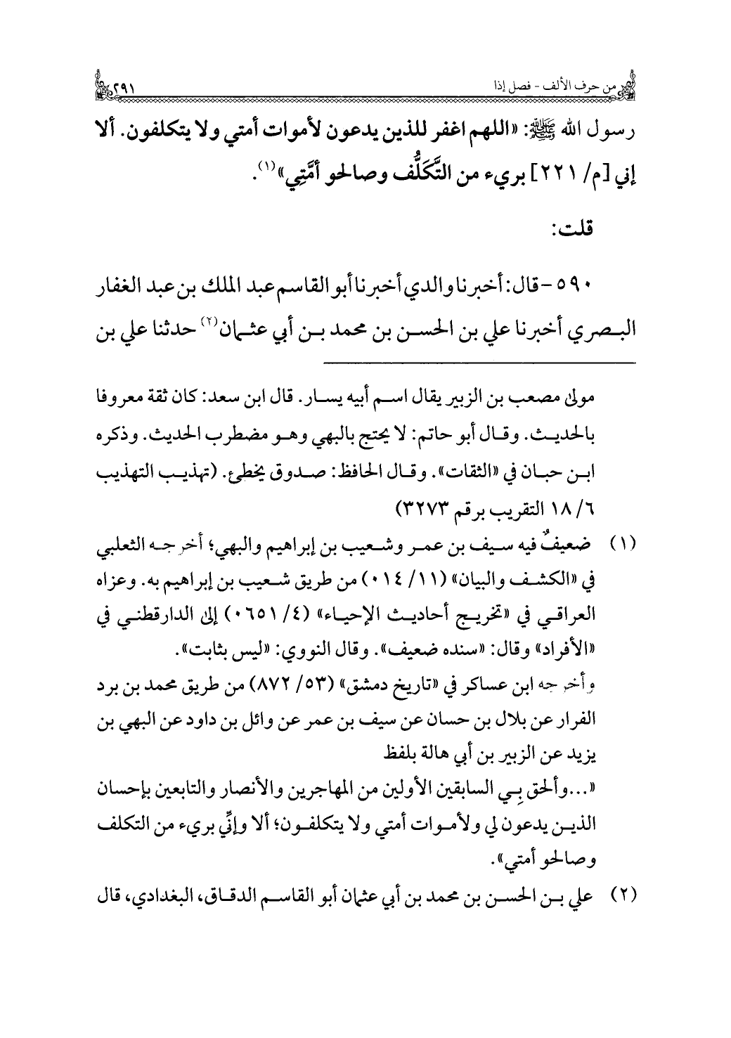 (¬١) ضعيفٌ فيه سيف بن عمر وشعيب بن إبراهيم والبهي؛ أخرجه الثَّعلبي في "الكشف والبيان" (١١/ ٠١٤) من طريق شعيب بن إبراهيم به. وعزاه العراقي في "تخريج أحاديث الإحياء" (٤/ ٠٦٥١) إلى الدارقطني في "الأفراد" وقال: "سنده ضعيف". وقال النووي: "ليس بثابت".
