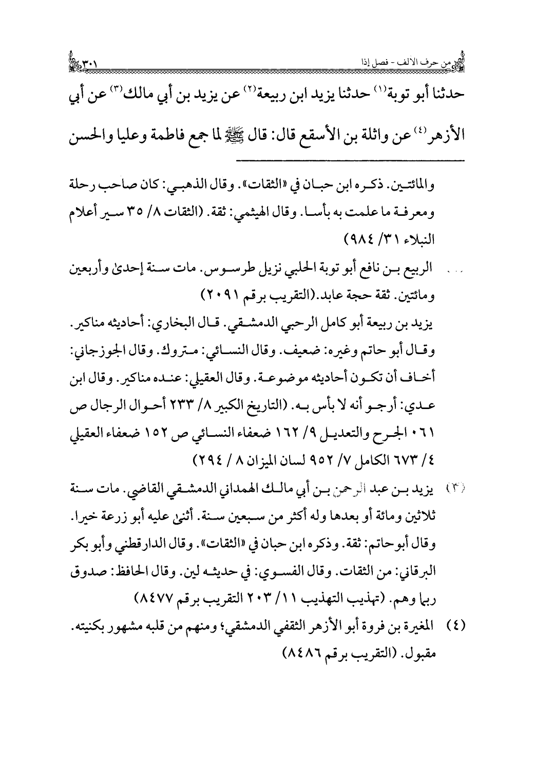 حدثنا أبو توبة (¬١) حدثنا يزيد ابن ربيعة (¬٢) عن يزيد بن أبي مالك (¬٣) عن أبي الأزهر (¬٤) عن واثلة بن الأسقع قال: قال - صلى الله عليه وسلم - لما جمع فاطمة وعليًّا والحسن