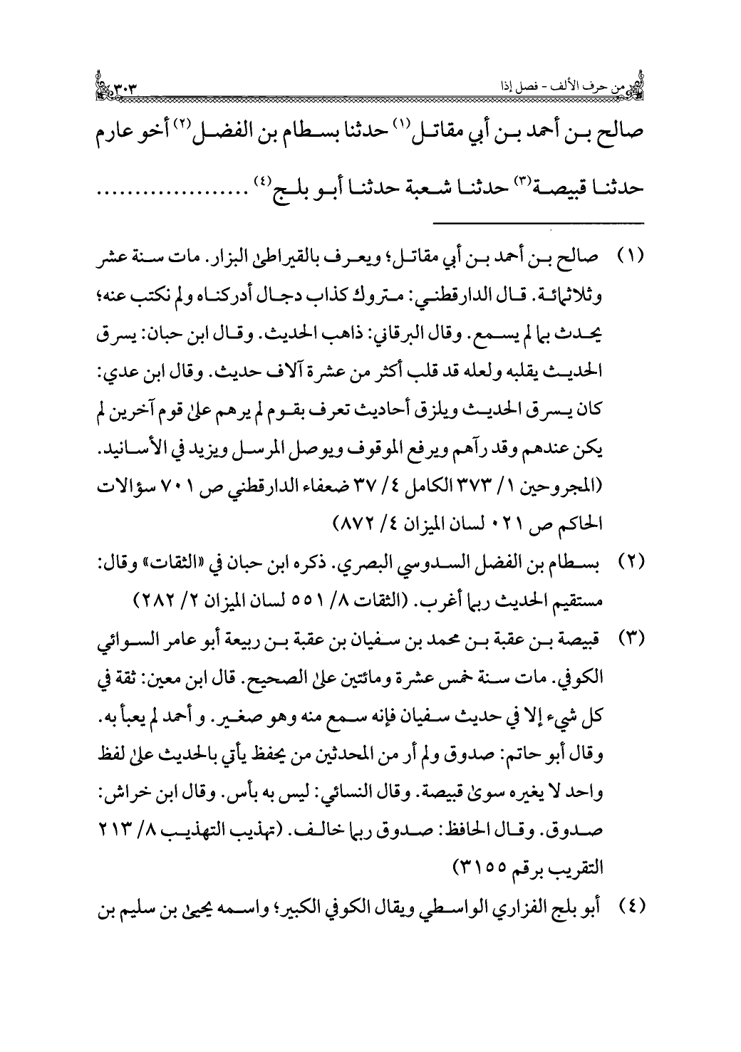 صالح بن أحمد بن أبي مقاتل (¬١) حدثنا بسطام بن الفضل (¬٢) أخو عارم حدثنا قبيصة (¬٣) حدثنا شعبة حدثنا أبو بلج (¬٤)