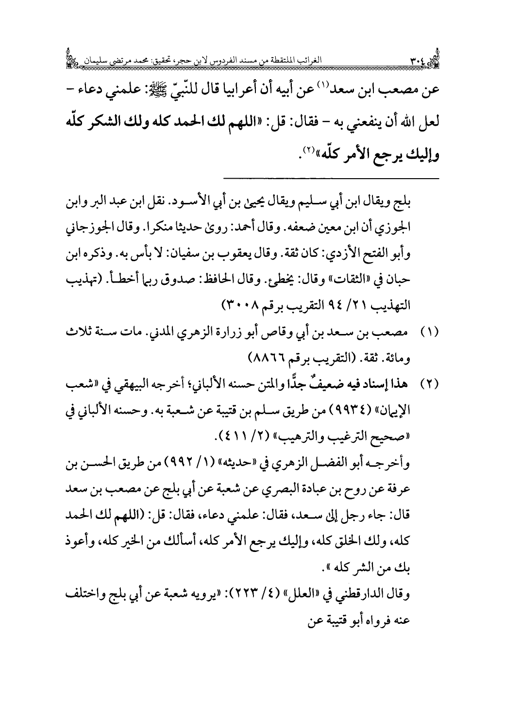 عن مصعب ابن سعد (¬١) عن أبيه أن أعرابيًّا قال للنّبيّ - صلى الله عليه وسلم -: علمني دعاء - لعل الله أن ينفعني به - فقال: قل: "اللهم لك الحمد كله ولك الشكر كلّه وإليك يرجع الأمر كلّه" (¬٢).