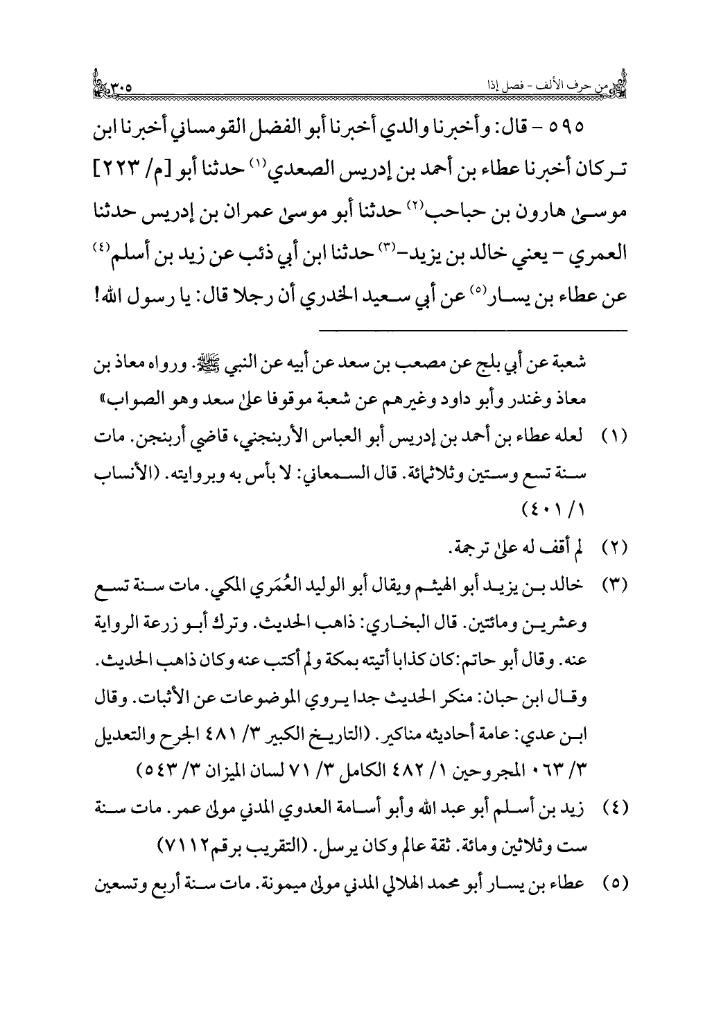 ٥٩٥ - قال: وأخبرنا والدي أخبرنا أبو الفضل القومساني أخبرنا ابن تركان أخبرنا عطاء بن أحمد بن إدريس الصعدي (¬١) حدثنا أبو موسى هارون بن حباحب (¬٢) حدثنا أبو موسى عمران بن إدريس حدثنا العمري - يعني خالد بن يزيد - (¬٣) حدثنا ابن أبي ذئب عن زيد بن أسلم (¬٤) عن عطاء بن يسار (¬٥) عن أبي سعيد الخدري أن رجلًا قال: يا رسول الله!
