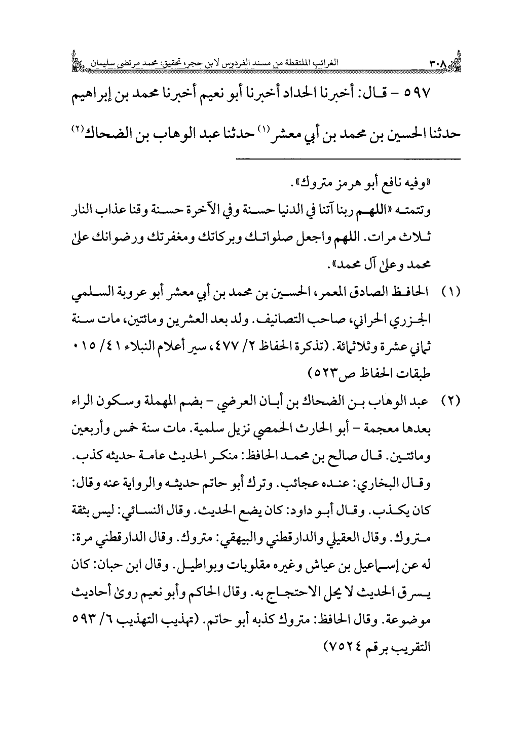 ٥٩٧ - قال: أخبرنا الحداد أخبرنا أبو نعيم أخبرنا محمد بن إبراهيم حدثنا الحسين بن محمد بن أبي معشر (¬١) حدثنا عبد الوهاب بن الضحاك (¬٢)