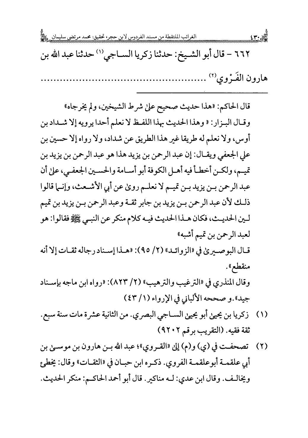 ٦٦٢ - قال أبو الشيخ: حدثنا زكريا الساجي (¬١) حدثنا عبد الله بن هارون الفَرْوي (¬٢)