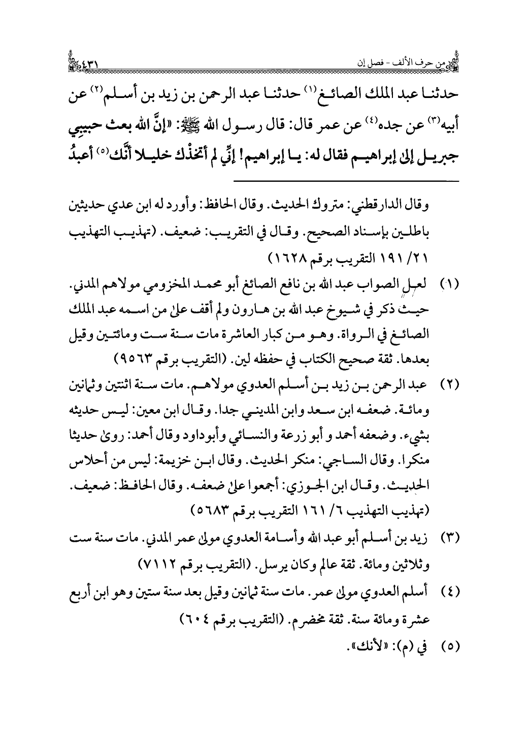 حدثنا عبد الملك الصَّائغ (¬١) حدثنا عبد الرحمن بن زيد بن أسلم (¬٢) عن أبيه (¬٣) عن جده (¬٤) عن عمر قال: قال رسول الله - صلى الله عليه وسلم -: "إنَّ الله بعث حبيبِي جبربل إلى إبراهيم فقال له: يا إبراهيم! إنِّي لم أتخذْك خليلًا أَنك (¬٥) أعبدُ