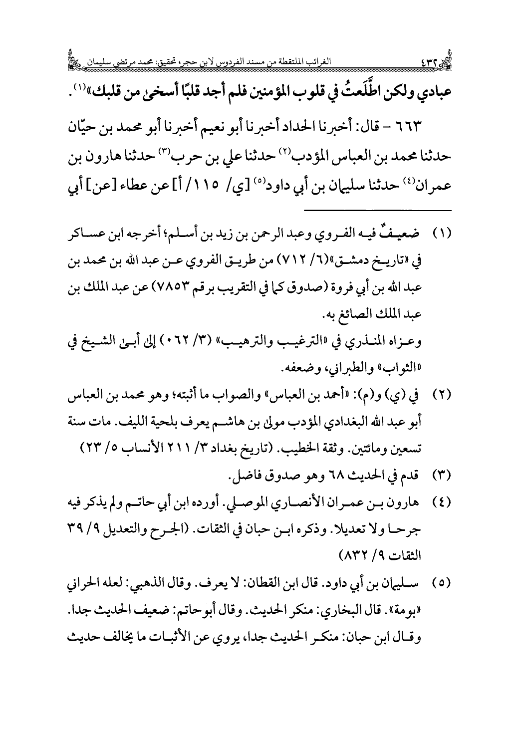 (¬٤) هارون بن عمران الأنصاري الموصلي. أورده ابن أبي حاتم ولم يذكر فيه جرحًا ولا تعديلًا. وذكره ابن حبان في الثقات. (الجرح والتعديل ٩/ ٣٩ الثقات ٩/ ٨٣٢)