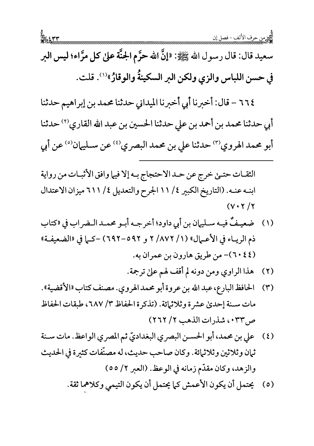 ٦٦٤ - قال: أخبرنا أبي أخبرنا الميداني حدثنا محمد بن إبراهيم حدثنا أبي حدثنا محمد بن أحمد بن علي حدثنا الحسين بن عبد الله القاري (¬٢) حدثنا أبو محمد الهروي (¬٣) حدثنا علي بن محمد البصري (¬٤) عن سليمان (¬٥) عن أبي