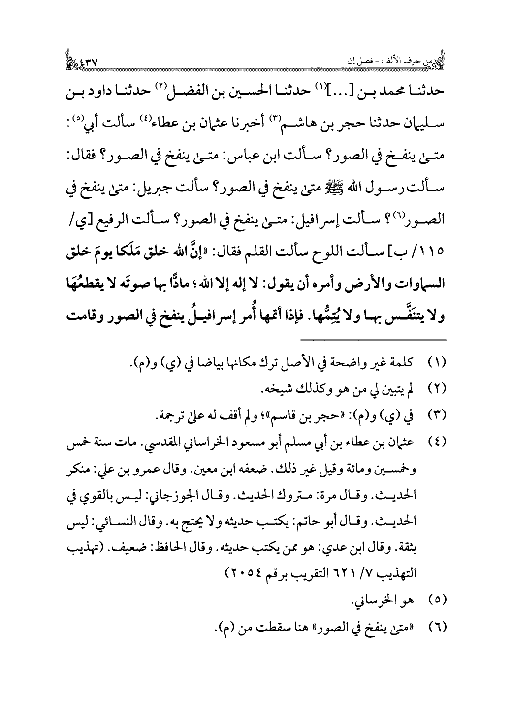 حدثنا محمد بن [ ... ] (¬١) حدثنا الحسين بن الفضل (¬٢) حدثنا داود بن سليمان حدثنا حجر بن هاشم (¬٣) أخبرنا عثمان بن عطاء (¬٤) سألت أبي (¬٥): متى ينفخ في الصور؟ سألت ابن عباس: متى ينفخ في الصور؟ فقال: سألت رسول الله - صلى الله عليه وسلم - متى ينفخ في الصور؟ سألت جبريل: متى ينفخ في الصور (¬٦)؟ سألت إسرافيل: متى ينفخ في الصور؟ سألت الرفيع سألت اللوح سألت القلم فقال: "إنَّ الله خلق مَلكا يومَ خلق السماوات والأرض وأمره أن يقول: لا إله إلا الله؛ مادًّا بها صوتَه لا يقطعُهَا ولا يتنَفَّس بها ولا يُتِمُّها. فإذا أتمها أُمر إسرافيلُ ينفخ في الصور وقامت