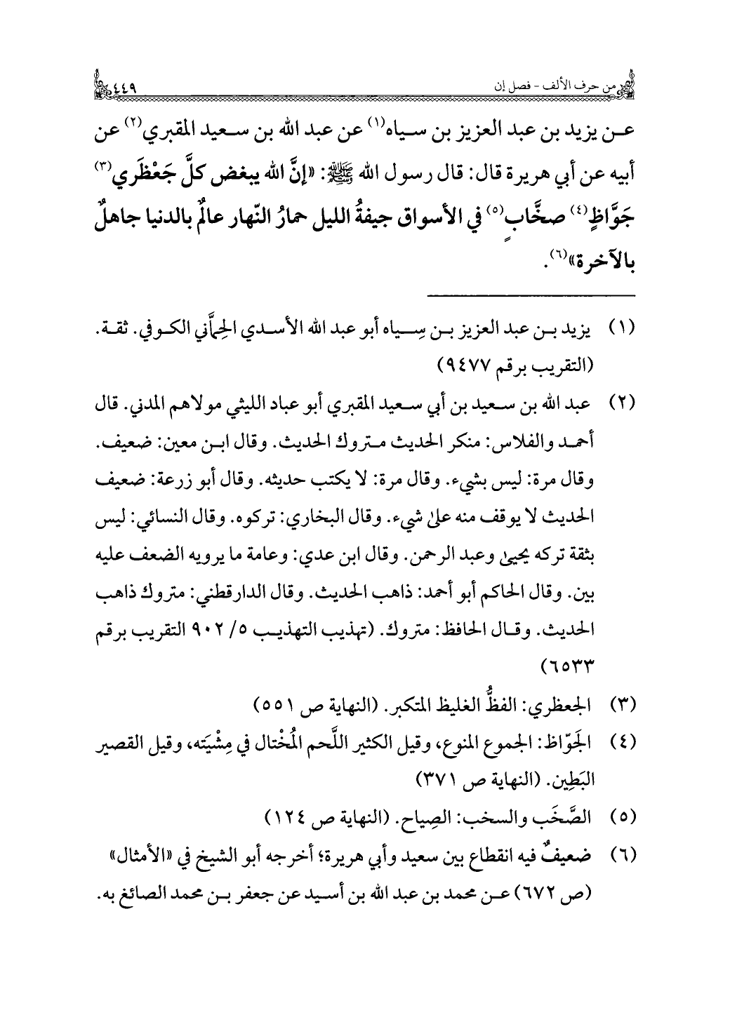 عن يزيد بن عبد العزيز بن سياه (¬١) عن عبد الله بن سعيد المقبري (¬٢) عن أبيه عن أبي هريرة قال: قال رسول الله - صلى الله عليه وسلم -: "إنَّ الله يبغض كلَّ جَعْظَري (¬٣) جَوَّاظٍ (¬٤) صخَّابٍ (¬٥) في الأسواق جيفةُ الليل حمارُ النّهار عالمٌ بالدنيا جاهلٌ بالآخرة" (¬٦).