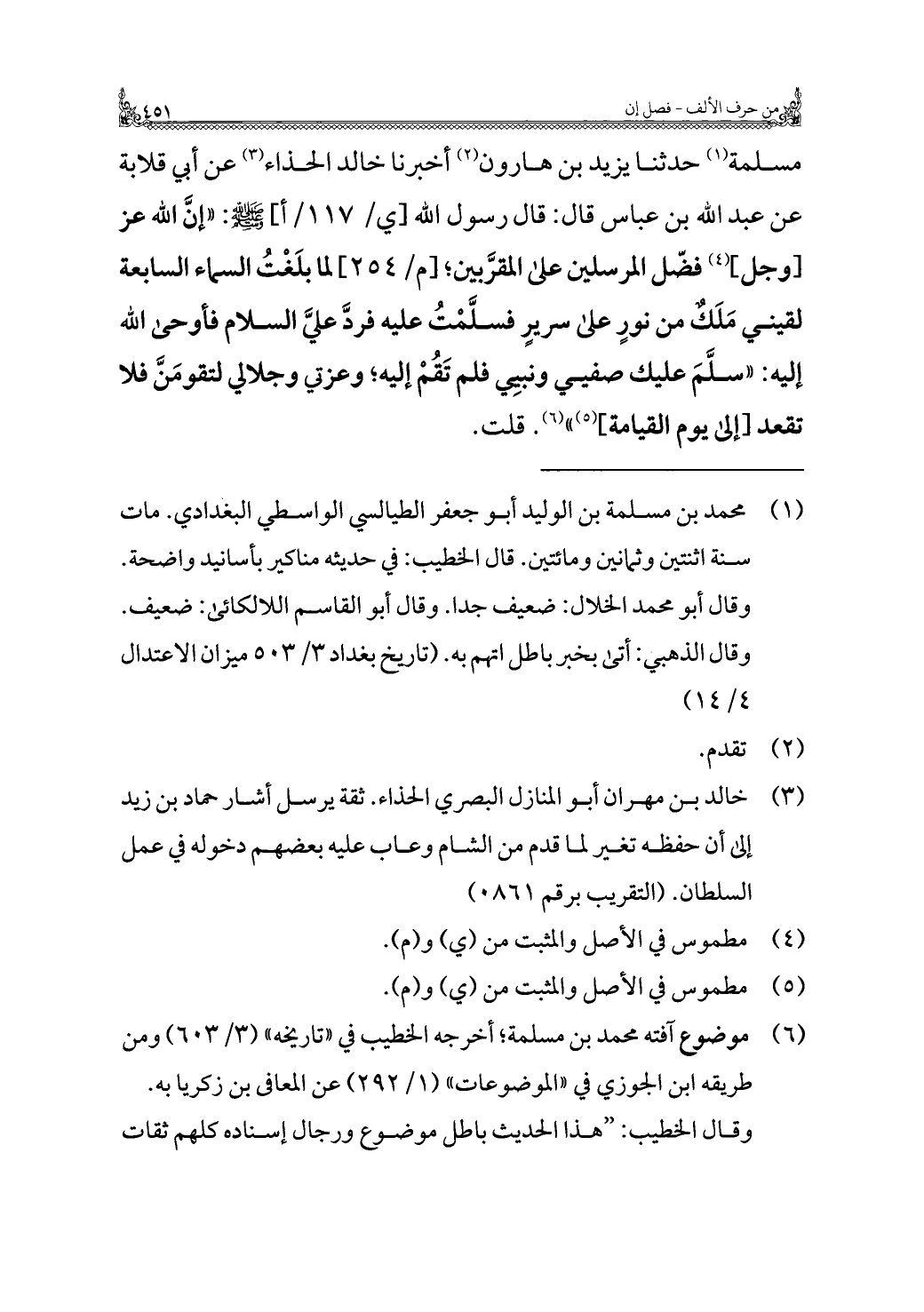 مسلمة (¬١) حدثنا يزيد بن هارون (¬٢) أخبرنا خالد الحذاء (¬٣) عن أبي قلابة عن عبد الله بن عباس قال: قال رسول الله - صلى الله عليه وسلم -: "إنَّ الله عز [وجل] (¬٤) فضّل المرسلين على المقرَّبين؛ لما بلَغْتُ السماء السابعة لقيني مَلكٌ من نورٍ على سريرٍ فسلَّمْتُ عليه فردَّ عليَّ السلام فأوحى الله إليه: "سلَّمَ عليك صفيي ونبيِي فلم تَقُمْ إليه؛ وعزتي وجلالي لتقومَنَّ فلا تقعد [إلى يوم القيامة] (¬٥) " (¬٦). قلت.