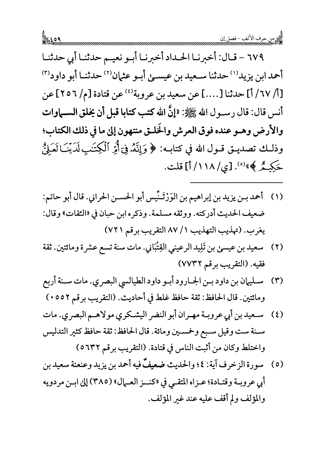 ٦٧٩ - قال: أخبرنا الحداد أخبرنا أبو نعيم حدثنا أبي حدثنا أحمد بن يزيد (¬١) حدثنا سعيد بن عيسى أبو عثمان (¬٢) حدثنا أبو داود (¬٣) حدثنا [ .... ] عن سعيد بن عروبة (¬٤) عن قتادة عن أنس قال: قال رسول الله - صَلَّى اللهُ عَلَيْهِ وَسَلَّمَ -: "إنَّ الله كتب كتابًا قبل أن يخلق السماوات والأرض وهو عنده فوق العرش والخَلق منتهون إلى ما في ذلك الكتاب؛ وذلك تصديق قول الله في كتابه: {وَإِنَّهُ فِي أُمِّ الْكِتَابِ لَدَيْنَا لَعَلِيٌّ حَكِيمٌ} " (¬٥). قلت.