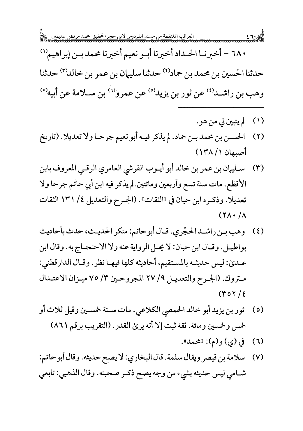 (¬٤) وهب بن راشد الحجري. قال أبو حاتم: منكر الحديث، حدث بأحاديث بواطيل. وقال ابن حبان: لا يحل الرواية عنه ولا الاحتجاج به. وقال ابن عدى: ليس حديثه بالمستقيم، أحاديثه كلها فيها نظر. وقال الدارقطني: متروك. (الجرح والتعديل ٩/ ٢٧ المجروحين ٣/ ٧٥ ميزان الاعتدال ٤/ ٣٥٢)