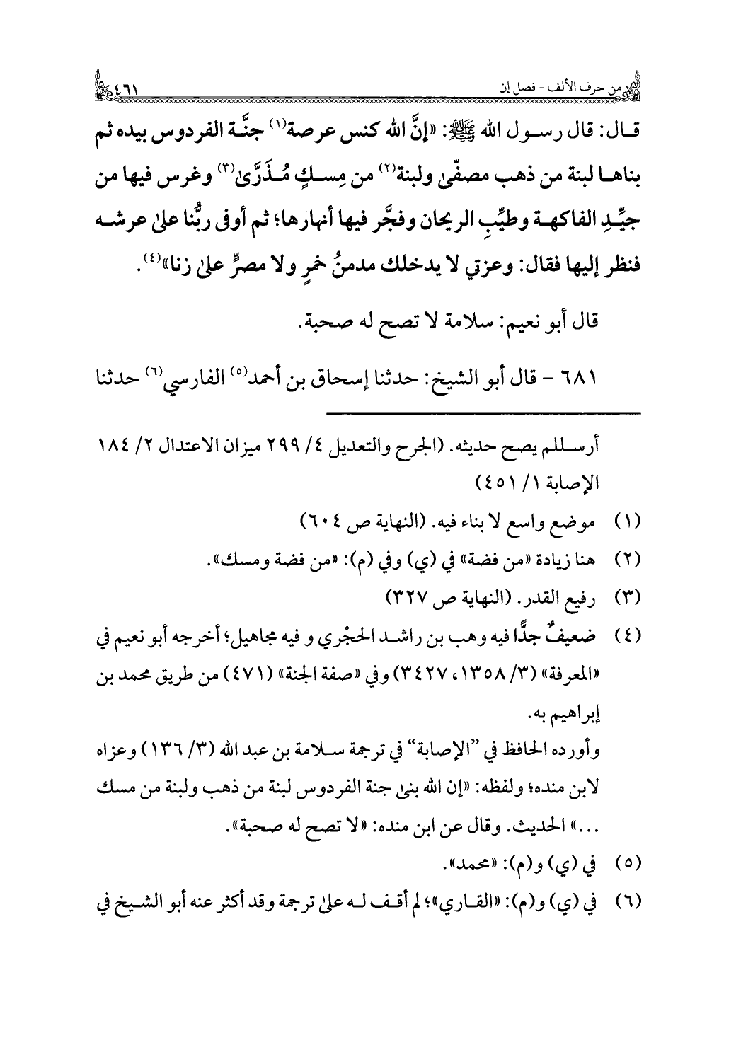 (¬٤) ضعيفٌ جدًّا فيه وهب بن راشد الحجْري وفيه مجاهيل؛ أخرجه أبو نعيم في "المعرفة" (٣/ ١٣٥٨، ٣٤٢٧) وفي "صفة الجَنَّة" (٤٧١) من طريق محمد بن إبْرَاهِيم به.