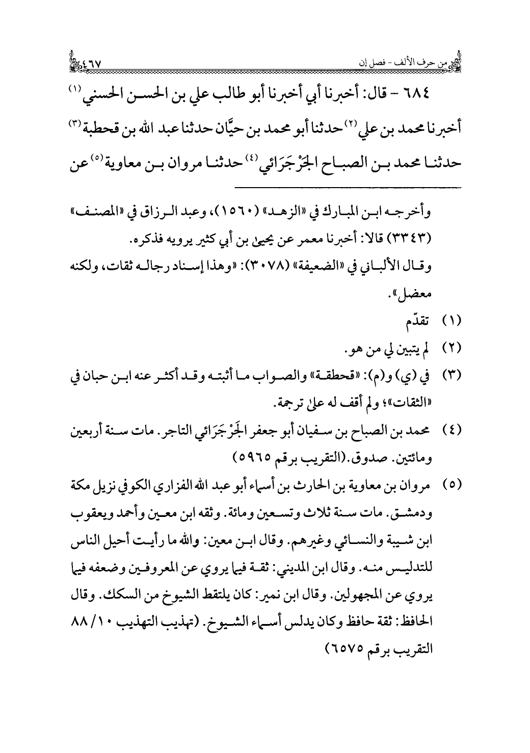 ٦٨٤ - قال: أخبرنا أبي أخبرنا أبو طالب علي بن الحسن الحسني (¬١) أخبرنا محمد بن علي (¬٢) حدثنا أبو محمد بن حيَّان حدثنا عبد الله بن قحطبة (¬٣) حدثنا محمد بن الصباح الجرْجَرَائي (¬٤) حدثنا مروان بن معاوية (¬٥) عن