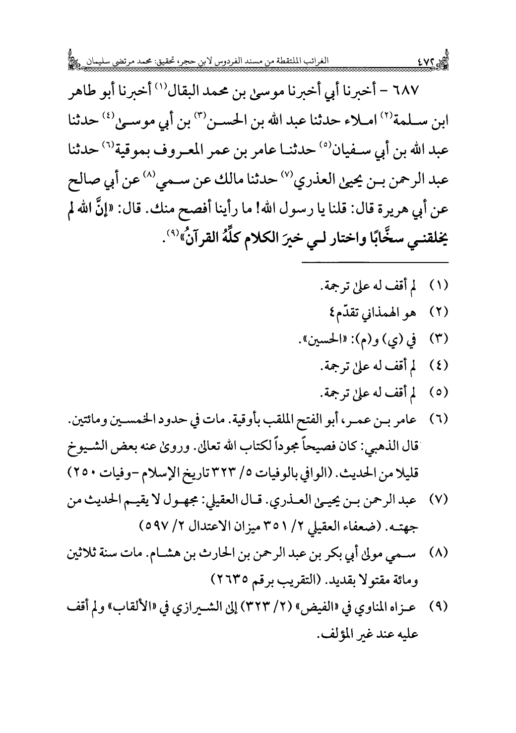 ٦٨٧ - أخبرنا أبي أخبرنا موسى بن محمد البقال (¬١) أخبرنا أبو طاهر بن سلمة (¬٢) املاء حدثنا عبد الله بن الحسن (¬٣) بن أبي موسى (¬٤) حدثنا عبد الله بن أبي سفيان (¬٥) حدثنا عامر بن عمر المعروف بموقية (¬٦) حدثنا عبد الرَّحمن بن يَحْيَى العذري (¬٧) حدثنا مالك عن سُمي (¬٨) عن أبي صالح عن أبي هُرَيْرَةَ قال: قلنا يا رسول الله! ما رأينا أفصح منك. قال: "إنَّ الله لم يخلقني سخَّابًا واختار لي خيرَ الكلام كلِّهُ القرآنُ" (¬٩).