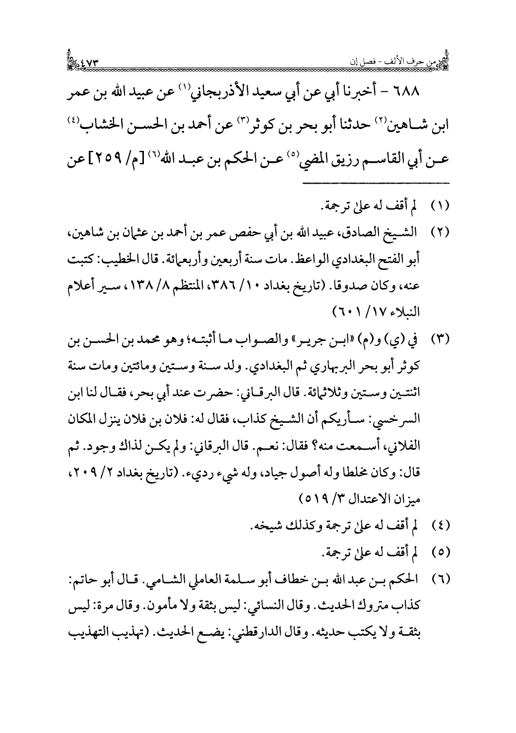 ٦٨٨ - أخبرنا أبي عن أبي سعيد الأذربجاني (¬١) عن عبيد الله بن عمر بن شاهين (¬٢) حدثنا أبو بحر بن كوثر (¬٣) عن أحمد بن الحسن الخشاب (¬٤) عن أبي القاسم رزيق المضي (¬٥) عن الحكم بن عبد الله (¬٦) عن