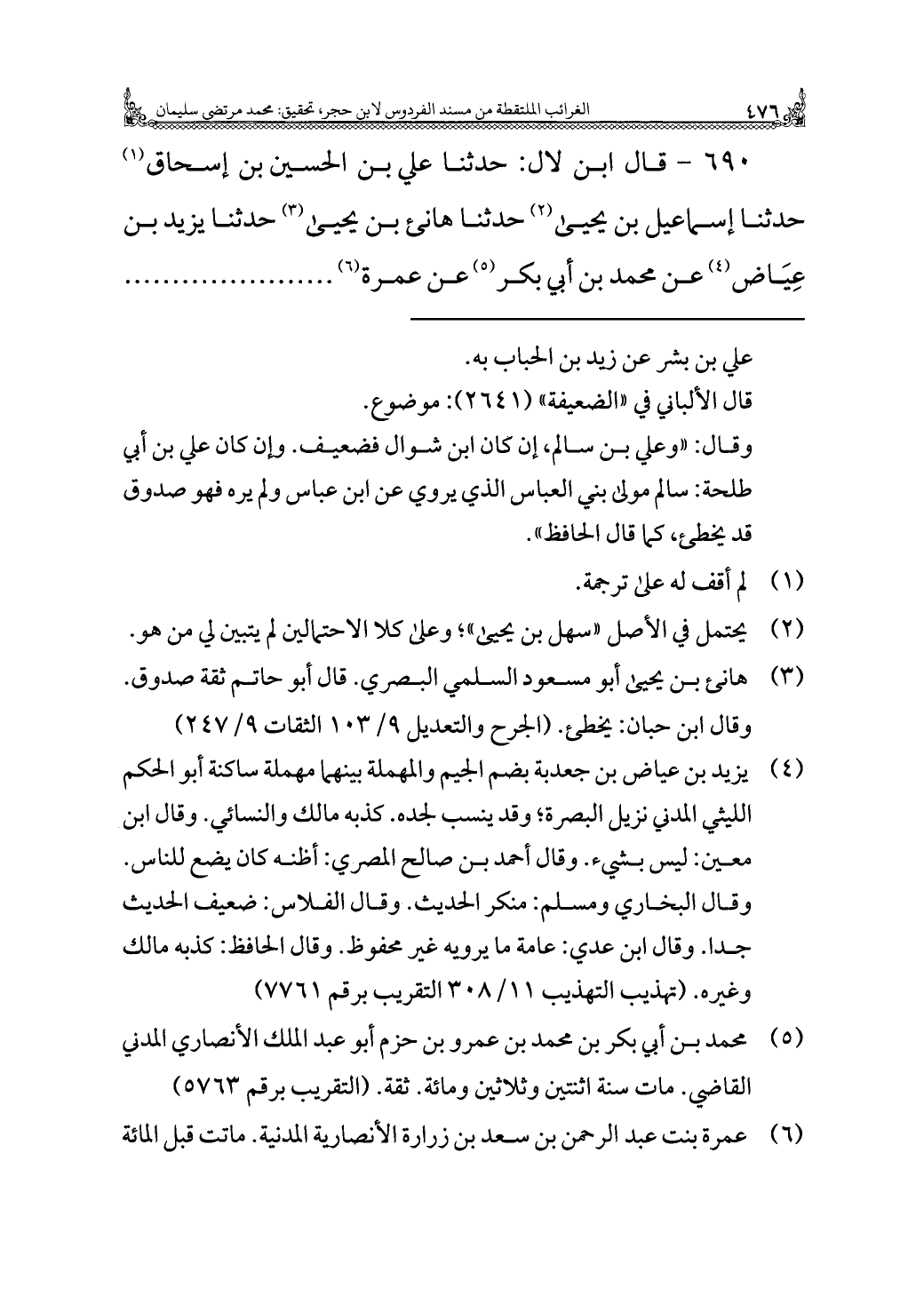 وقال: "وعلي بن سالم، إن كان ابن شوال فضعيف. وإِن كان علي بن أبي طلحة: سالم مولى بني العباس الذي يروي عن ابن عَبَّاسٍ ولم يره فهو صدوق قد يخطئ كما قال الحافظ".