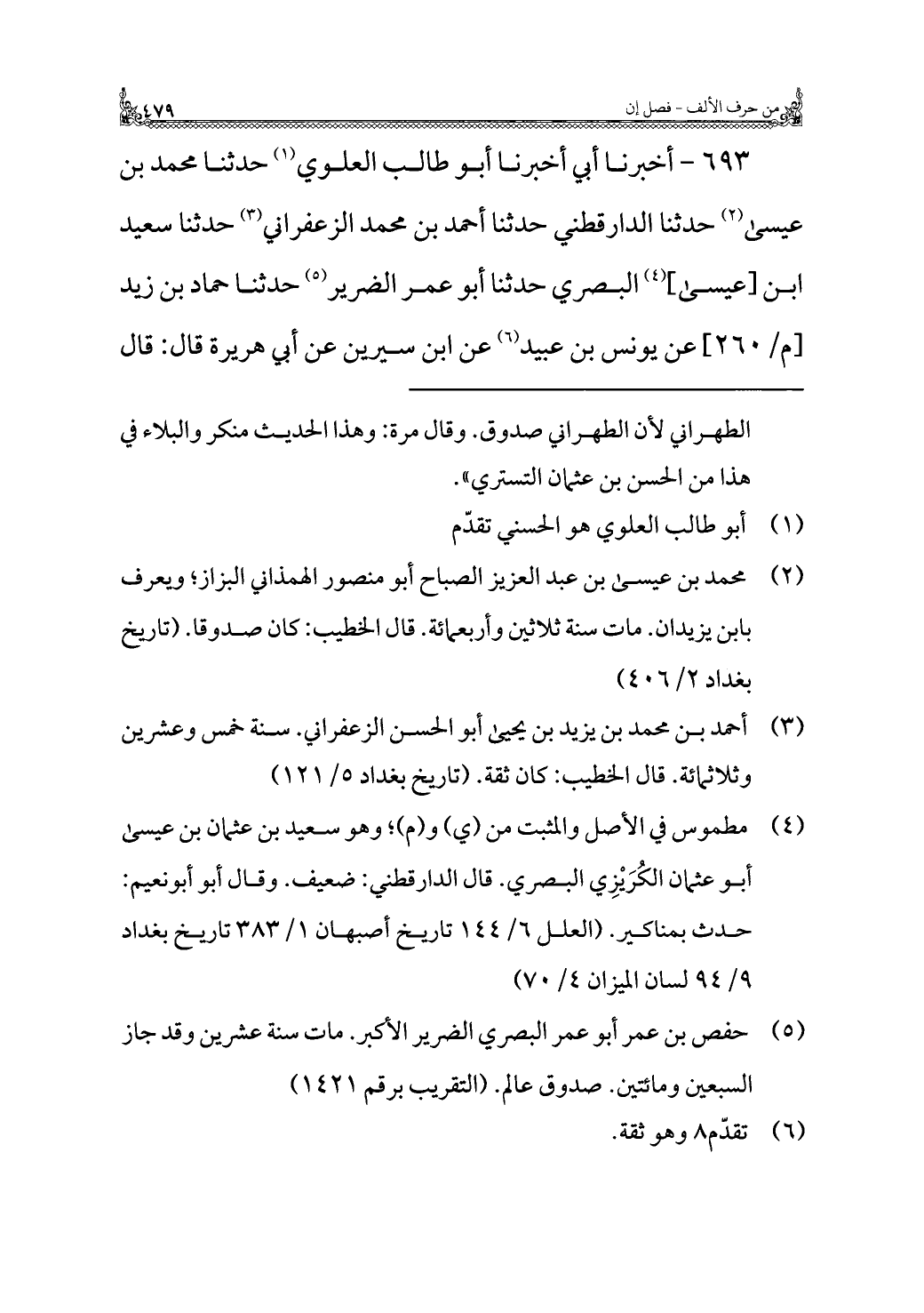 ٦٩٣ - أخبرنا أبي أخبرنا أبو طالب العلوي (¬١) حدثنا محمد بن عيسى (¬٢) حدثنا الدارقطني حدثنا أحمد بن محمد الزعفراني (¬٣) حدثنا سعيد ابن [عيسى] (¬٤) البصري حدثنا أبو عمر الضرير (¬٥) حدثنا حماد بن زيد عن يونس بن عبيد (¬٦) عن ابن سيرين عن أبي هُرَيْرَةَ قال: قال