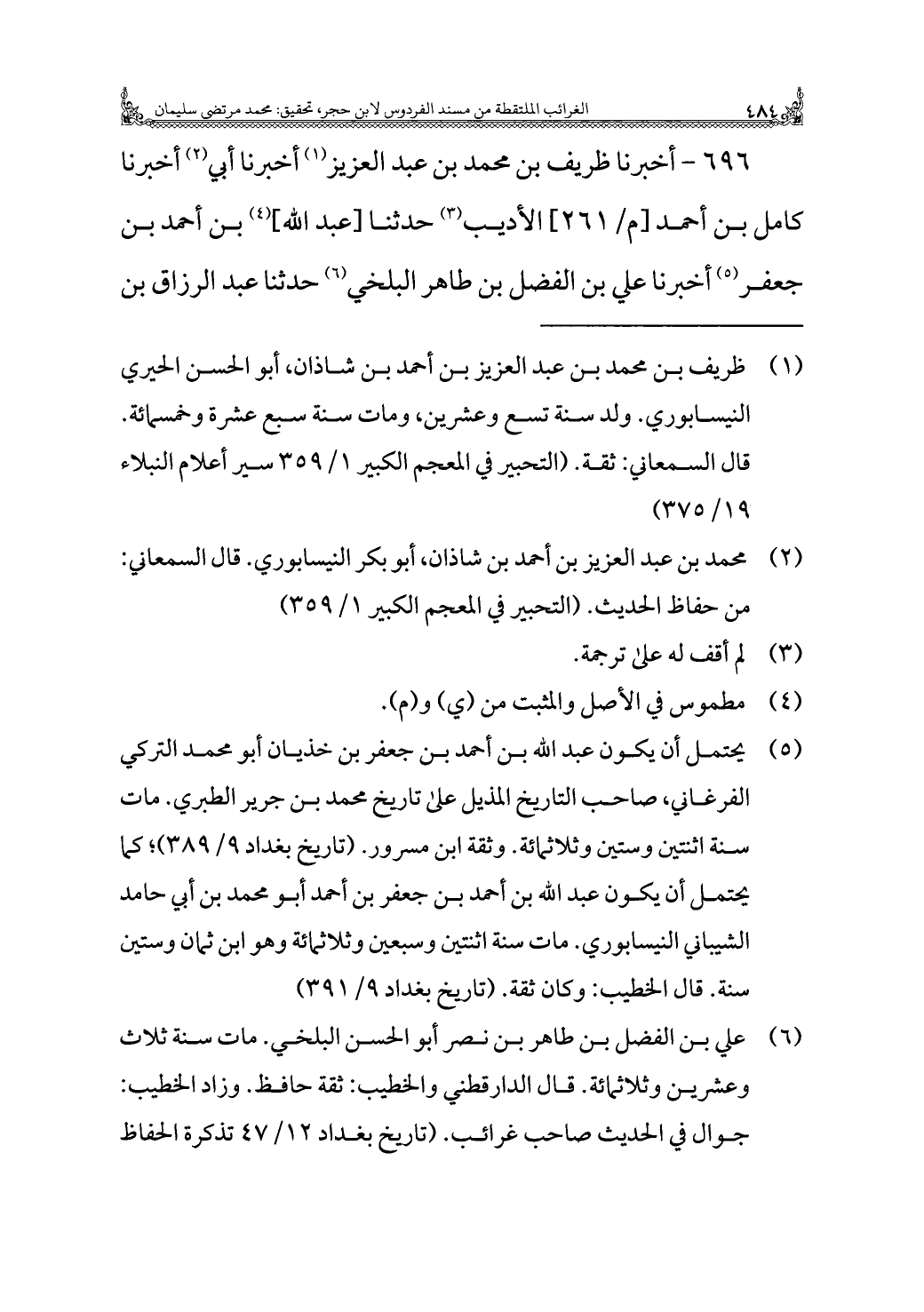 (¬٦) علي بن الفضل بن طاهر بن نصر أبو الحسن البلخي. مات سنة ثلاث وعشرين وثلاثمائة. قال الدارقطني والخطيب: ثقة حافظ. وزاد الخطيب: جوال في الحديث صاحب غرائب. (تاريخ بغداد ١٢/ ٤٧ تذكرة الحفّاظ =