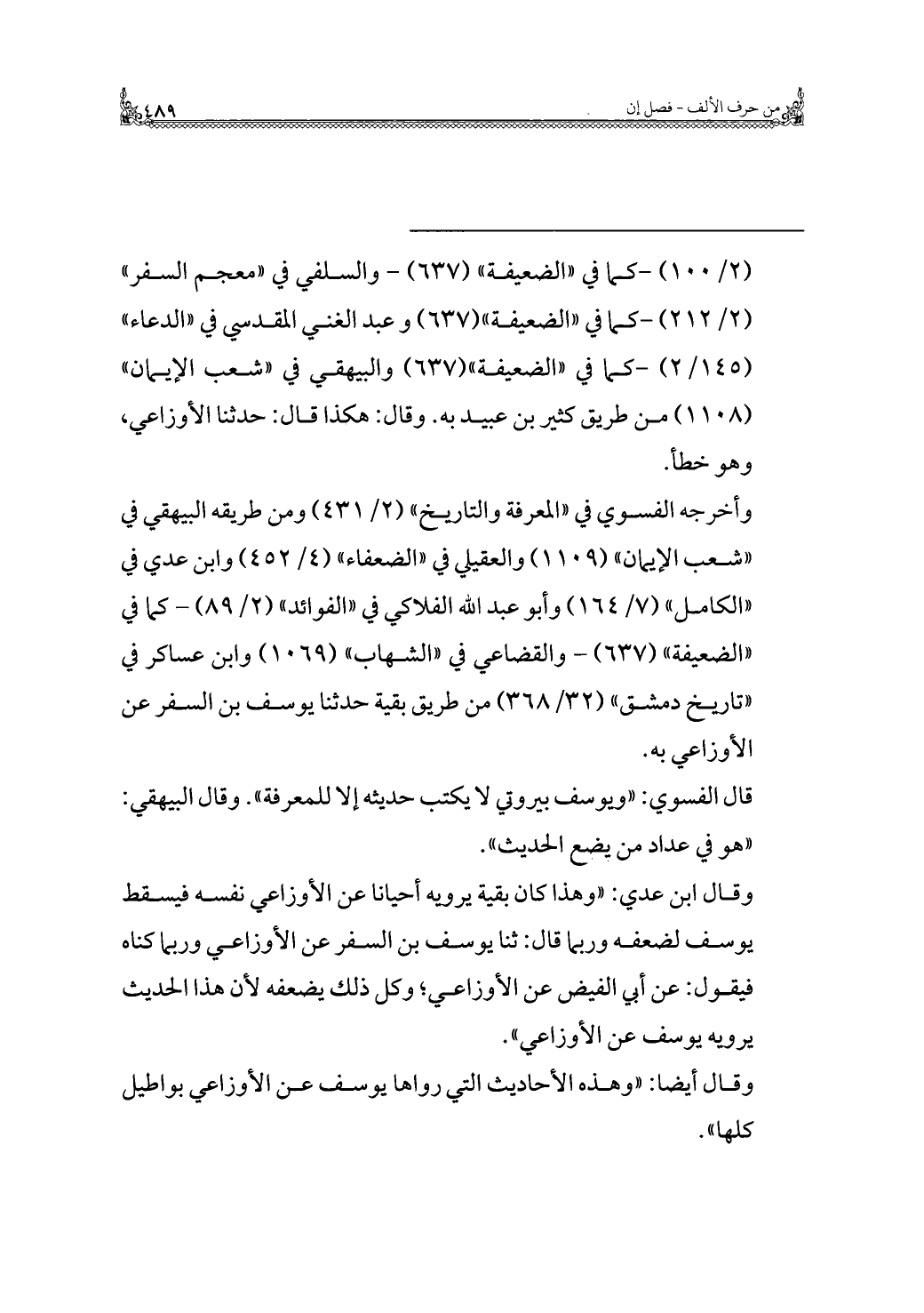 وقال ابن عديّ: "وهذا كان بقية يرويه أحيانًا عن الأوزاعي نفسه فيسقط يوسف لضعفه وربما قال: ثنا يوسف بن السفر عن الأوزاعي وربما كناه فيقول: عن أبي الفيض عن الأوزاعي، وكل ذلك يضعفه لأنَّ هذا الحديث يرويه يوسف عن الأوزاعي".