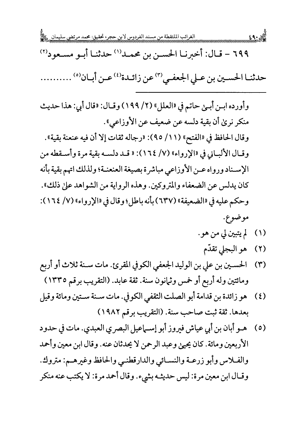 ٦٩٩ - قال: أخبرنا الحسن بن محمد (¬١) حدثنا أبو مسعود (¬٢) حدثنا الحسين بن علي الجعفي (¬٣) عن زائدة (¬٤) عن أبان (¬٥)