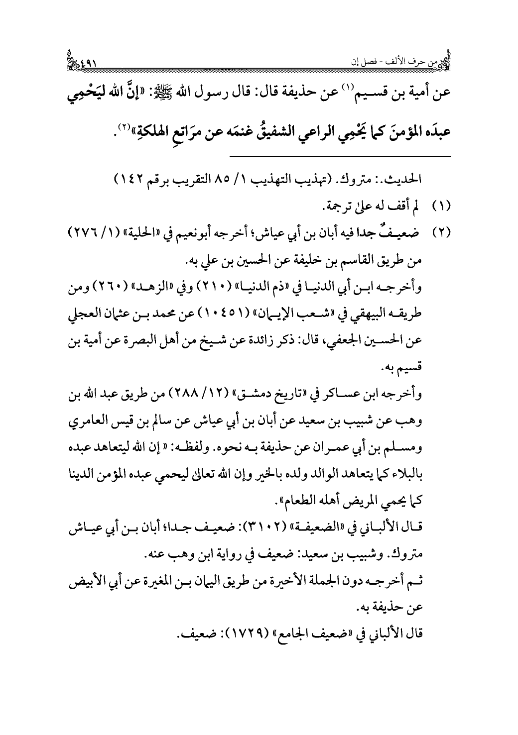 عن أمية بن قسيم (¬١) عن حذيفة قال: قال رسول الله - صَلَّى اللهُ عَلَيْهِ وَسَلَّمَ -: "إنَّ الله ليَحْمِي عبدَه المؤمنَ كما يَحْمِي الراعي الشفيقُ كنمَه عن مرَاتعِ الهلكةِ" (¬٢).