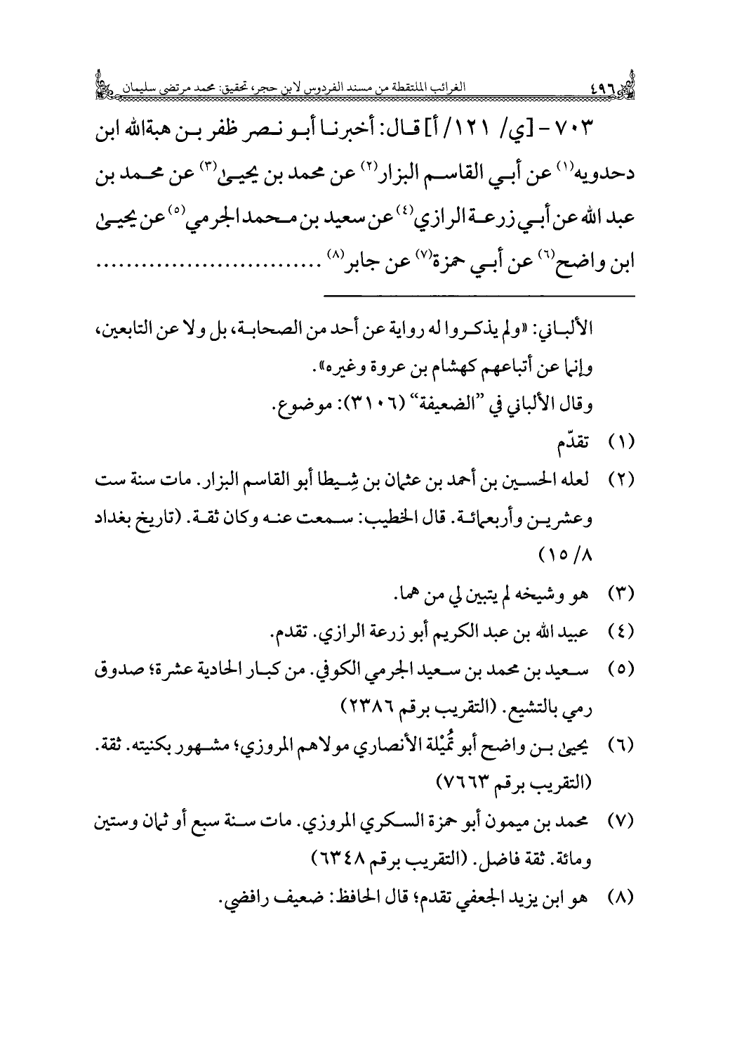 ٧٠٣ - قال: أخبرنا أبو نصر ظفر بن هبة الله ابن دحدويه (¬١) عن أبي القاسم البزار (¬٢) عن محمد بن يحيى (¬٣) عن محمد بن عبد الله عن أبي زرعة الرازي (¬٤) عن سعيد بن محمد الجرمي (¬٥) عن يحيى بن واضح (¬٦) عن أبي حمزة (¬٧) عن جابر (¬٨)
