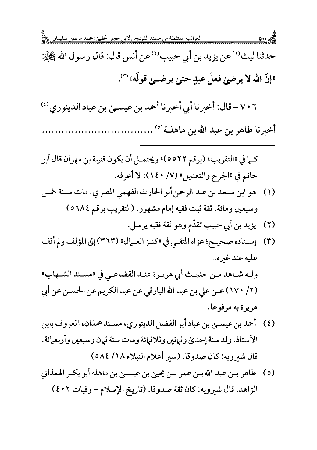 حدثنا ليث (¬١) عن يزيد بن أبي حبيب (¬٢) عن أنس قال: قال رسول الله - صَلَّى اللهُ عَلَيْهِ وَسَلَّمَ -: "إنَّ الله لا يرضى فعلَ عبدٍ حتى يرضى قولَه" (¬٣).
