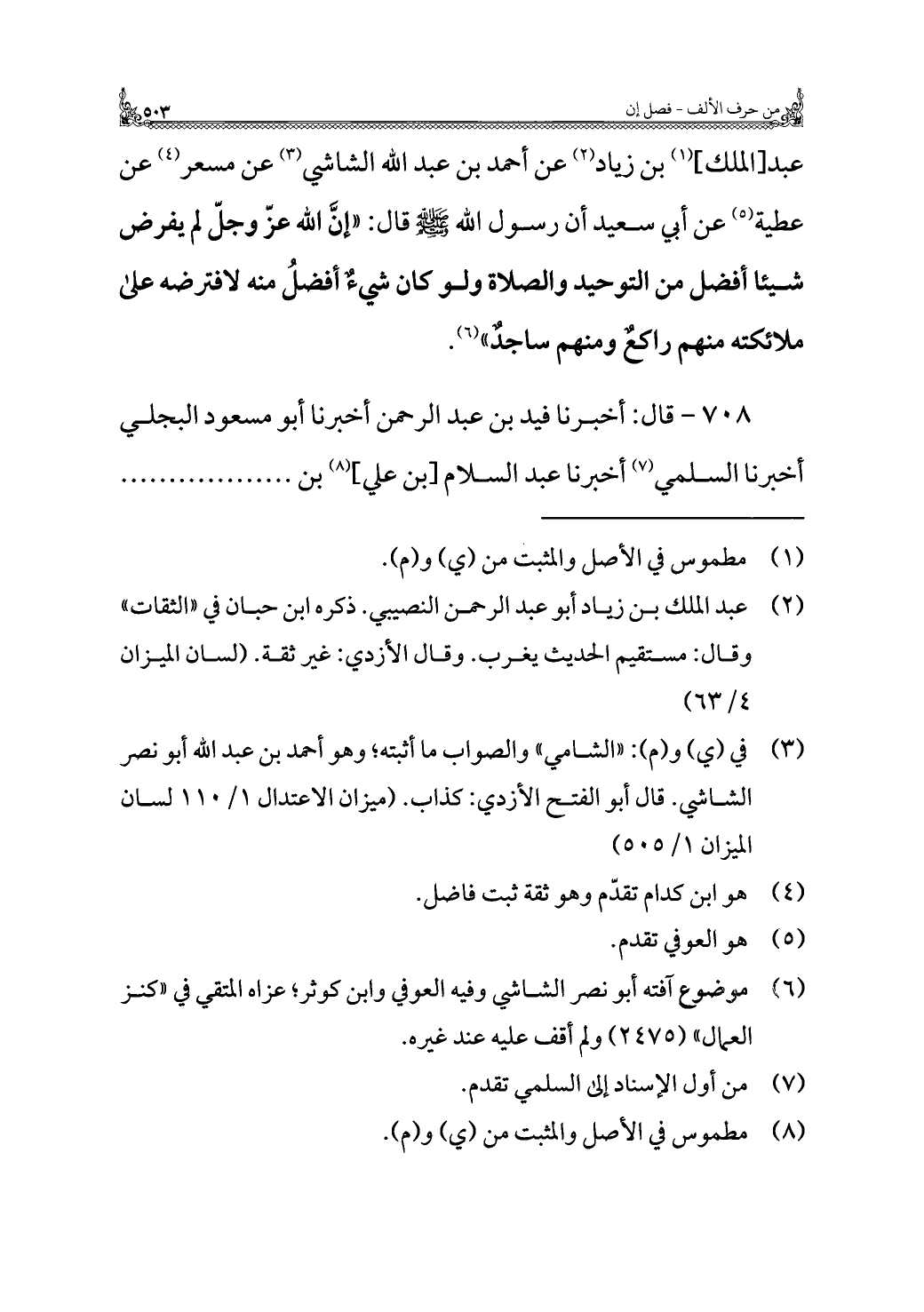 عبد [الملك] (¬١) بن زياد (¬٢) عن أحمد بن عبد الله الشاشي (¬٣) عن مسعر (¬٤) عن عطية (¬٥) عن أبي سعيد أن رسول الله - صَلَّى اللهُ عَلَيْهِ وَسَلَّمَ - قال: "إنَّ الله عزّ وجلّ لم يفرض شيئًا أفضل من التوحيد والصلاة ولو كان شيءٌ أفضلُ منه لافترضه على ملائكته منهم راكعٌ ومنهم ساجدٌ" (¬٦).