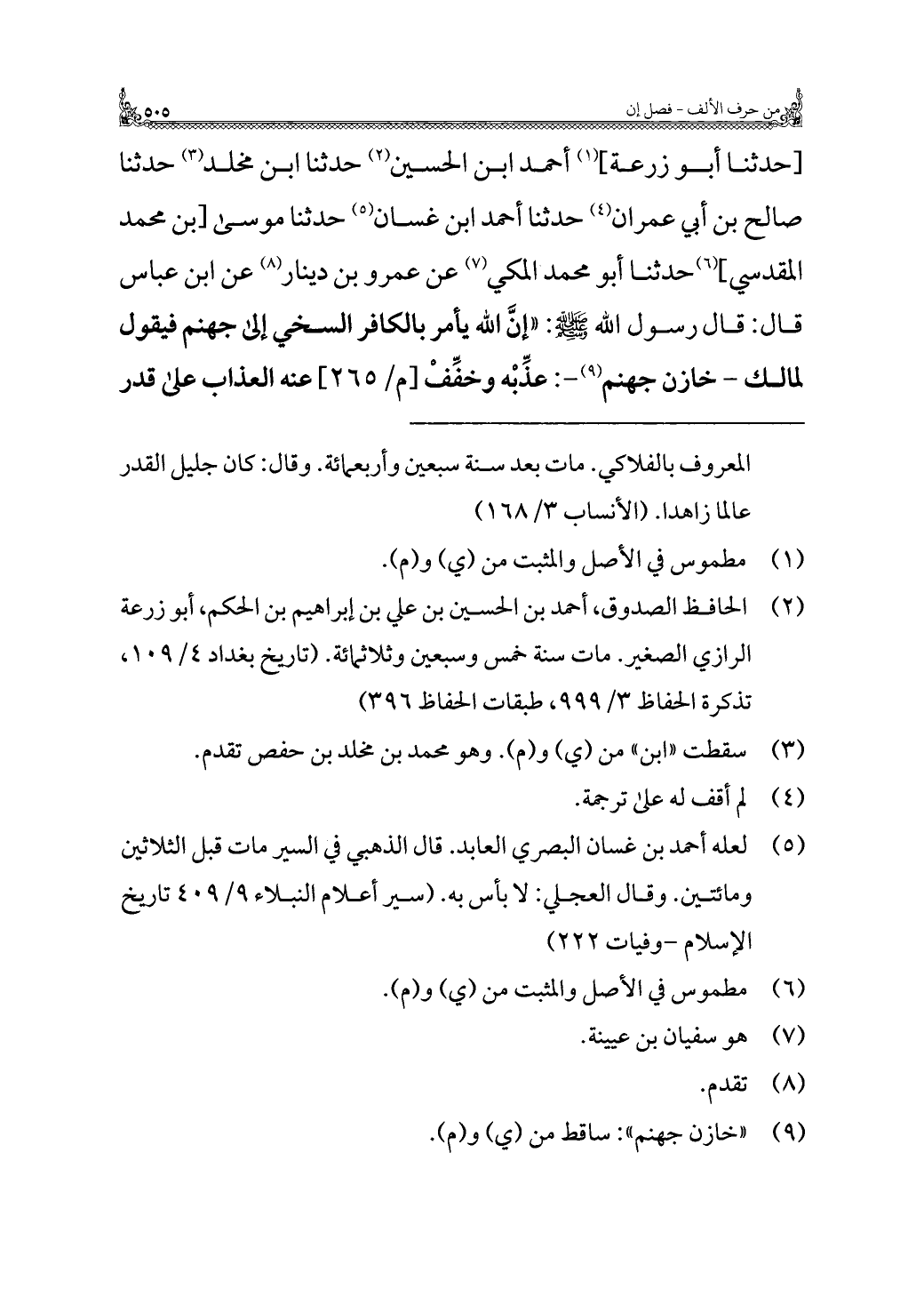 [حدثنا أبو زرعة] (¬١) أحمد بن الحسين (¬٢) حدثنا ابن مخلد (¬٣) حدثنا صالح بن أبي عمران (¬٤) حدثنا أحمد بن غسَّان (¬٥) حدثنا موسى [بن محمد المقدسي] (¬٦) حدثنا أبو محمد المكي (¬٧) عن عمرو بن دينار (¬٨) عن ابن عَبَّاسٍ قال: قال رسول الله: "إنَّ الله يأمر بالكافر السخي إلى جهنم فيقول لمالك - خازن جهنم (¬٩) -: عذِّبْه وخفّفْ عنه العذاب على قدر