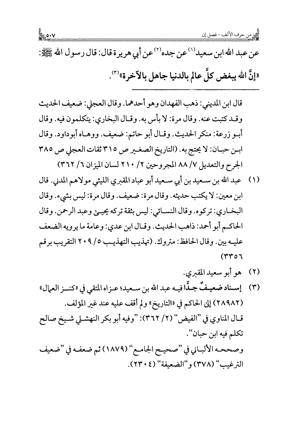 عن عبد الله بن سعيد (¬١) عن جده (¬٢) عن أبي هريرة قال: قال رسول الله - صَلَّى اللهُ عَلَيْهِ وَسَلَّمَ -: "إنَّ الله يبغض كلَّ عالم بالدنيا جاهل بالآخرة" (¬٣).