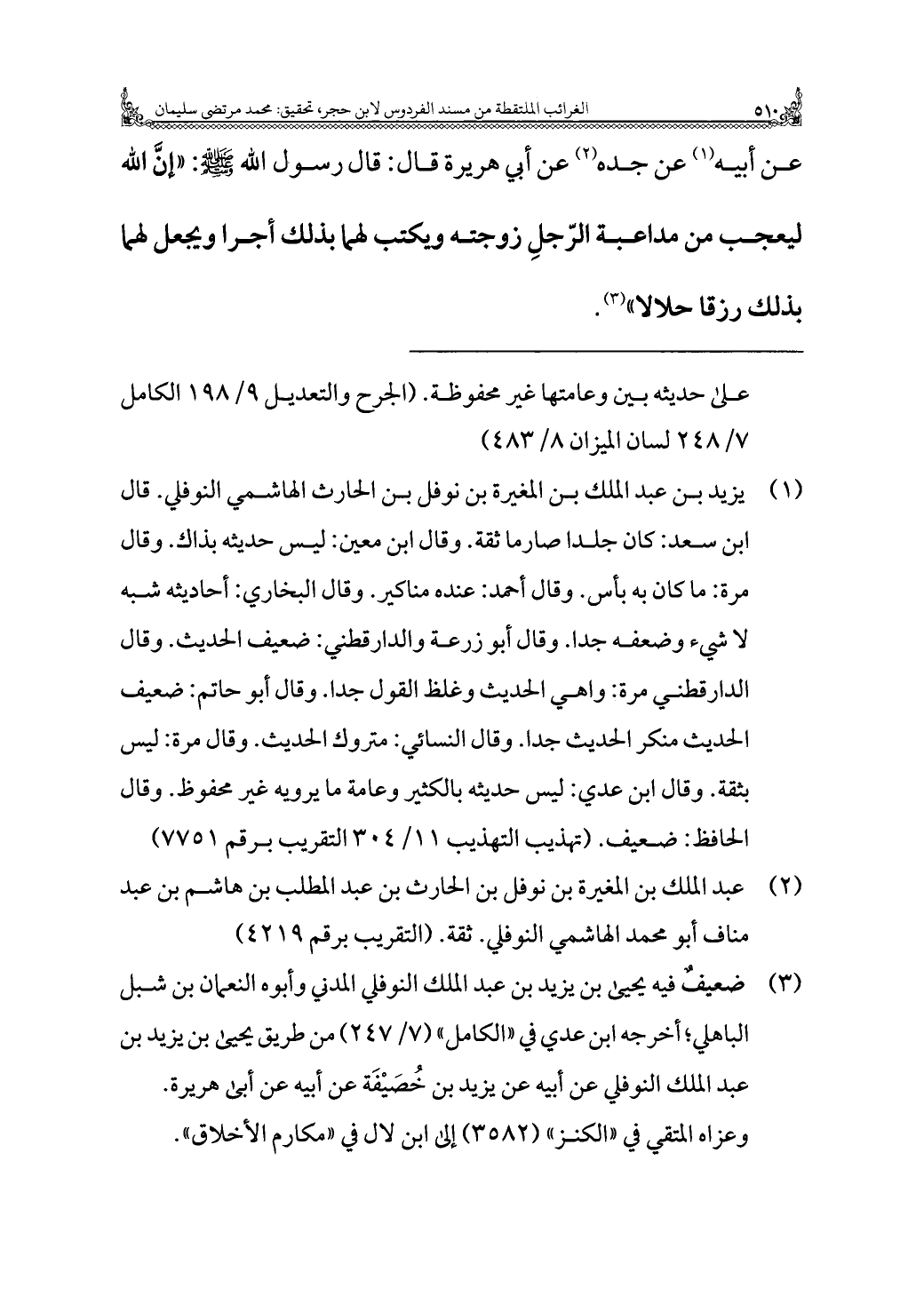 (¬١) يزيد بن عبد الملك بن المغيرة بن نوفل بن الحارث الهاشمي النوفلي. قال ابن سعد: كان جلدا صارما ثقة. وقال ابن معين: ليس حديثه بذاك. وقال مرة: ما كان بأس. وقال أحمد: عنده مناكير. وقال البخاري: أحاديثه شبه لا شيء وضعفه جدا. وقال أبو زرعة والدارقطني: ضعيف الحديث. وقال الدارقطني مرة: واهي الحديث وغلظ القول جدا. وقال أبو حاتم: ضعيف الحديث منكر الحديث جدا. وقال النسائي: متروك الحديث. وقال مرة: ليس بثقة. وقال ابن عدي: ليس حديثه بالكثير وعامة ما يرويه غير محفوظ. وقال الحافظ: ضعيف. (تهذيب التهذيب ١١/ ٣٠٤ التقريب برقم ٧٧٥١)