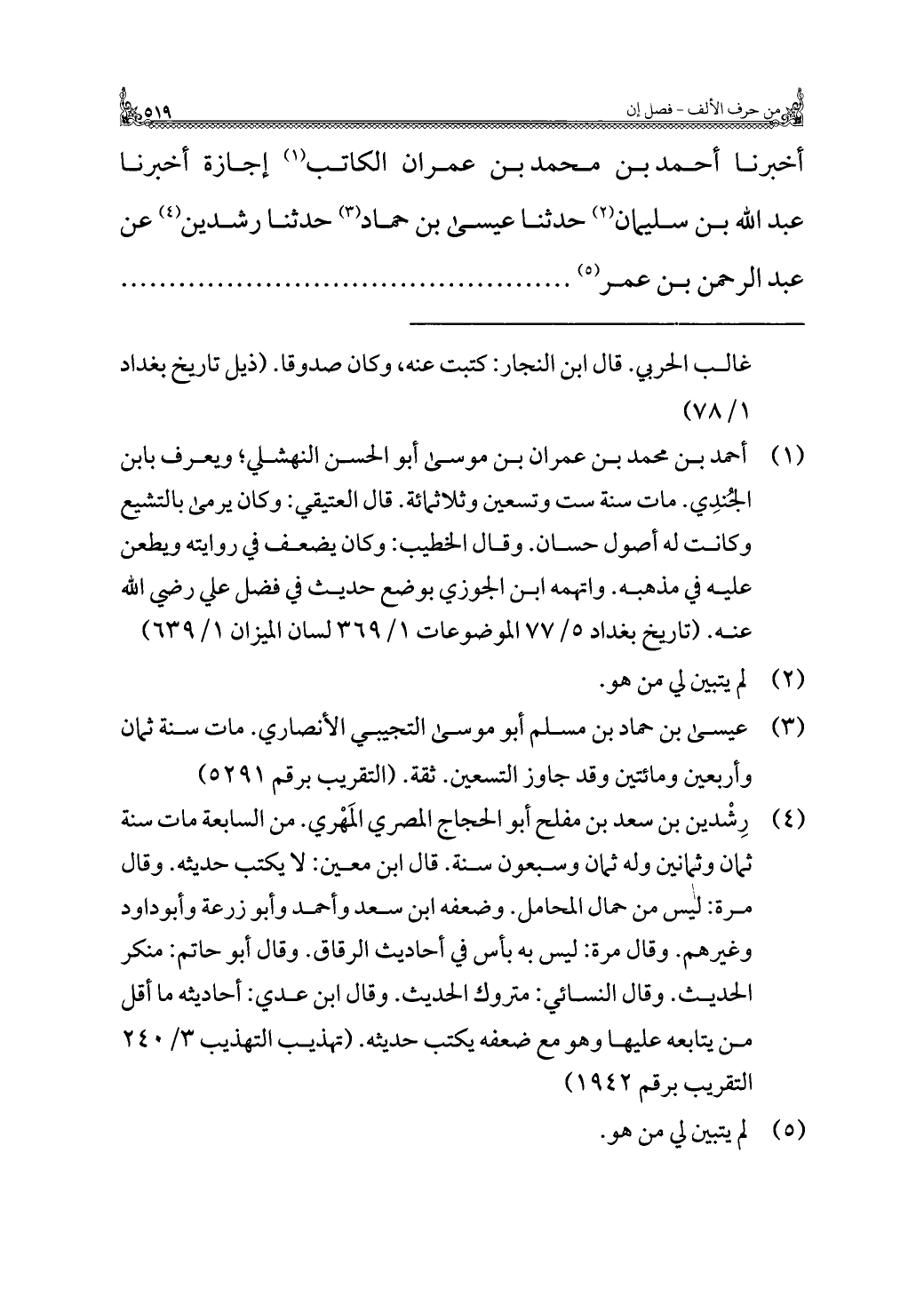 أخبرنا أحمد بن محمد بن عمران الكاتب (¬١) إجازة أخبرنا عبد الله بن سليمان (¬٢) حدثنا عيسى بن حماد (¬٣) حدثنا رشدين (¬٤) عن عبد الرحمن بن عمر (¬٥)