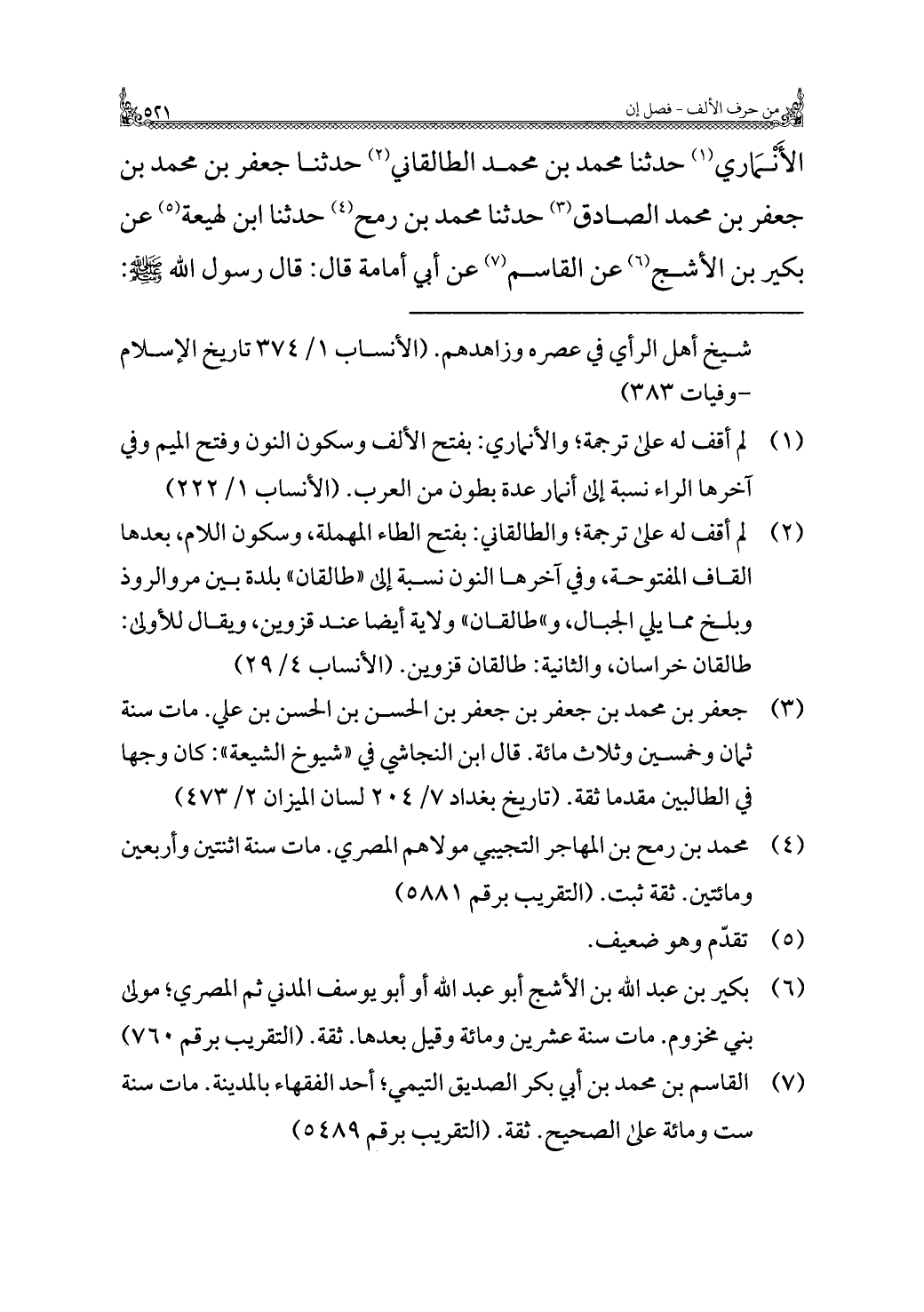 الأَنْمَاري (¬١) حدثنا محمد بن محمد الطالقاني (¬٢) حدثنا جعفر بن محمد بن جعفر بن محمد الصادق (¬٣) حدثنا محمد بن رمح (¬٤) حدثنا ابن لهيعة (¬٥) عن بكير بن الأشج (¬٦) عن القاسم (¬٧) عن أبي أمامة قال: قال رسول الله - صلى الله عليه وسلم -: