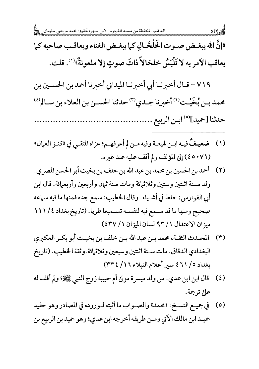 ٧١٩ - قال أخبرنا أبي أخبرنا الميداني أخبرنا أحمد بن الحسين بن محمد بن بُخَيْت (¬٢) أخبرنا جدي (¬٣) حدثنا الحسن بن العلاء بن سالم (¬٤) حدثنا [حميد] (¬٥) ابن الربيع